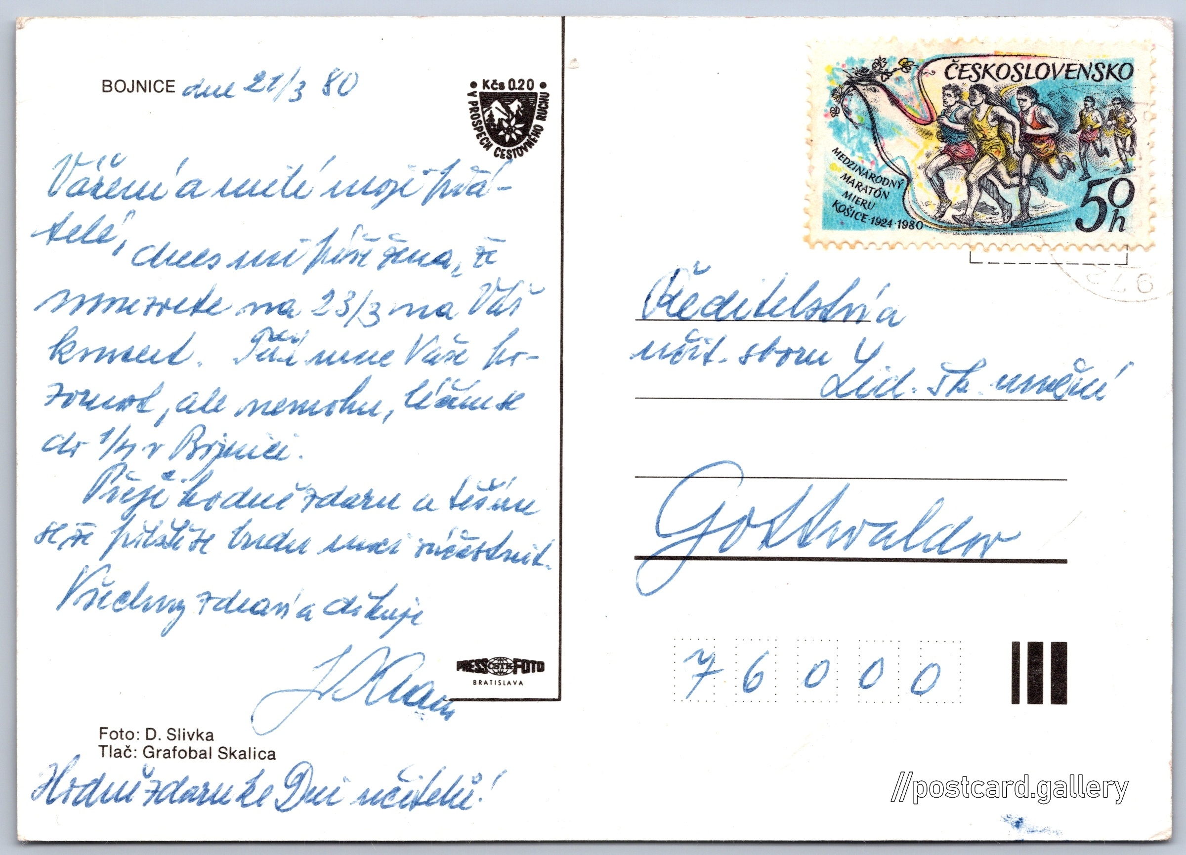 Bojnice, zámek 9/24 Pokud chcete vidět pohlednice ve vyšším rozlišení nebo zobrazovat jejich zadní stranu, tak se prosím nejdříve přihlašte Přihlásit Zaregistrovat BOJNICE Jazyk tištěného textu na pohlednici: slovenština Bojnický zámek, Zámek, Zámok a okolie 1/1, Bojnice, Slovensko ukázat na mapě V blízkém okolí místa zobrazeného na pohlednici lze najít 24 jiných pohlednic. Zobrazit blízké pohlednice Vydavatel: PressFoto Bratislava (Československo) Odhadované datum vydání pohlednice: 1977 - 1980 Pomozte nám zpřesnit rok vzniku pohlednice Velikost (š x v) a tvar pohlednice: 147 x 105 mm (5.79" x 4.13"), obdélník Osoby spjaté s touto pohlednicí: D. Slivka(Autor fotografie) Prošlá poštou:Datum na razítku: 21.3.1980Datum napsání pohledu: 21.3.1980 Ceny: Příplatek na tur. ruch: 0,20 Kčs (CSK))Vyplacené známky: 0,50 Kčs (CSK) DiskuseVložit příspěvek Přidat novou složku ... Spravovat složky ...