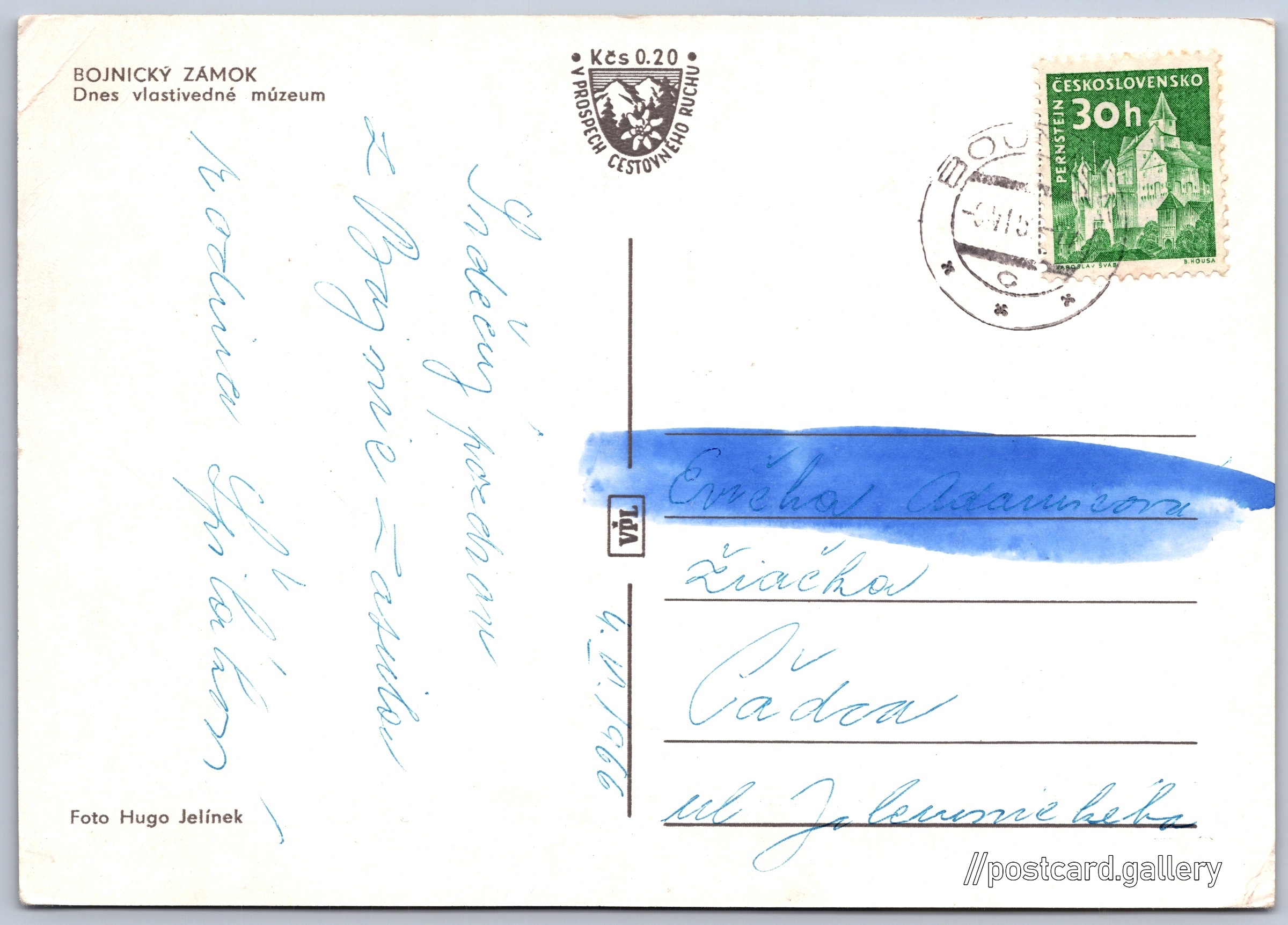 Bojnice, zámek Pokud chcete vidět pohlednice ve vyšším rozlišení nebo zobrazovat jejich zadní stranu, tak se prosím nejdříve přihlašte Přihlásit Zaregistrovat Ukázat zadní stranu pohlednice BOJNICKÝ ZÁMOKDnes vlastivedné múzeum Jazyk tištěného textu na pohlednici: slovenština Bojnice ukázat na mapě V blízkém okolí místa zobrazeného na pohlednici lze najít 24 jiných pohlednic. Zobrazit blízké pohlednice Vydavatel: VPL (Československo) Odhadované datum vydání pohlednice: 1963 - 1966 Pomozte nám zpřesnit rok vzniku pohlednice Velikost (š x v) a tvar pohlednice: 149 x 106 mm (5.87" x 4.17"), obdélník Osoby spjaté s touto pohlednicí: Hugo Jelínek(Autor fotografie) Prošlá poštou:Datum napsání pohledu: 4.5.1966 Ceny: Příplatek na tur. ruch: 0,20 Kčs (CSK))Vyplacené známky: 0,30 Kčs (CSK) DiskuseVložit příspěvek Přidat novou složku ... Spravovat složky ...