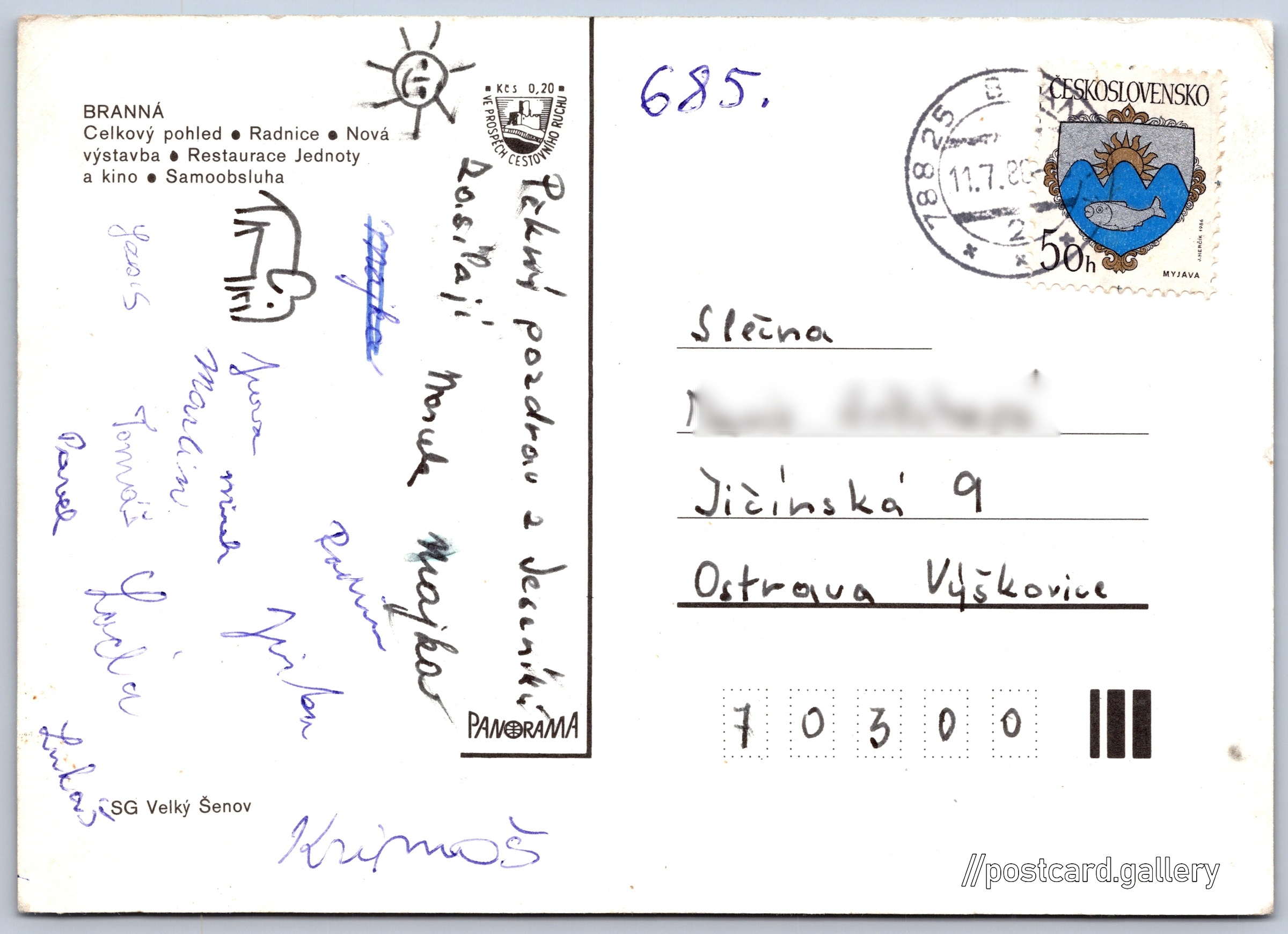 Branná Pokud chcete vidět pohlednice ve vyšším rozlišení nebo zobrazovat jejich zadní stranu, tak se prosím nejdříve přihlašte Přihlásit Zaregistrovat Branná BRANNÁ- Celkový pohled- Radnice- Nová výstavba- Restaurace Jednoty a kino- Samoobsluha Jazyk tištěného textu na pohlednici: čeština Branná, Obec, Česko ukázat na mapě Vydavatel: Panorama (Československo) Odhadované datum vydání pohlednice: 1977 - 1980 Pomozte nám zpřesnit rok vzniku pohlednice Velikost (š x v) a tvar pohlednice: 147 x 105 mm (5.79" x 4.13"), obdélník Prošlá poštou:Datum na razítku: 11.7.1980 Ceny: Cena pohlednice: 1,40 Kčs (CSK) (+0,20 Kčs přípl. na tur. ruch)Vyplacené známky: 0,50 Kčs (CSK) Kódy na pohlednici: 6-29515 170302101 6050 DiskuseVložit příspěvek Přidat novou složku ... Spravovat složky ...