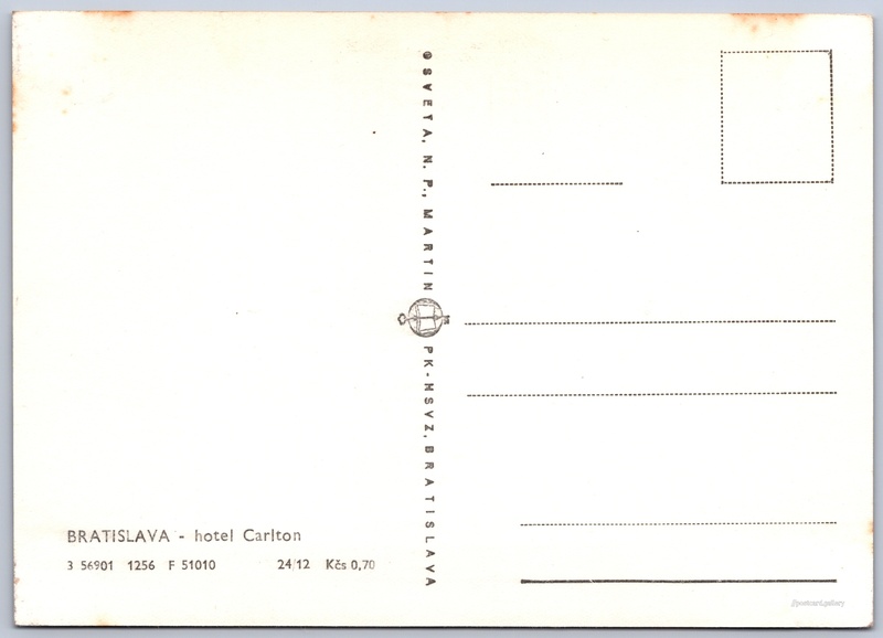 Bratislava, hotel Carlton Pokud chcete vidět pohlednice ve vyšším rozlišení nebo zobrazovat jejich zadní stranu, tak se prosím nejdříve přihlašte Přihlásit Zaregistrovat BRATISLAVA - hotel Carlton Jazyk tištěného textu na pohlednici: slovenština Hotel Carlton, Hviezdoslavovo namestie 3, Bratislava - Staré Mesto, Slovensko ukázat na mapě V blízkém okolí místa zobrazeného na pohlednici lze najít 43 jiných pohlednic. Zobrazit blízké pohlednice Vydavatel: Osveta, n. p., Martin PŠK - Bratislava (Československo) Rok vydání pohlednice: prosinec, 1956 Velikost (š x v) a tvar pohlednice: 146 x 105 mm (5.75" x 4.13"), obdélník Čistá pohlednice (neprošlá poštou) Ceny: Cena pohlednice: 0,70 Kčs (CSK) Kódy na pohlednici: 3 56901 1256 F 51010 24/12 DiskuseVložit příspěvek Přidat novou složku ... Spravovat složky ...