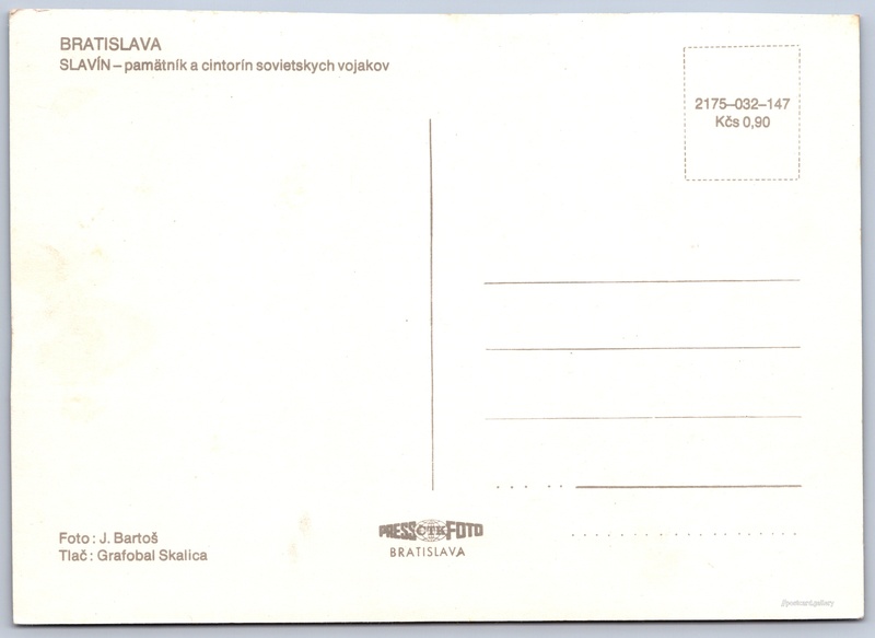 Bratislava, Slavín Pokud chcete vidět pohlednice ve vyšším rozlišení nebo zobrazovat jejich zadní stranu, tak se prosím nejdříve přihlašte Přihlásit Zaregistrovat BRATISLAVASLAVÍN - pamätník a cintorín sovietskych vojakov Jazyk tištěného textu na pohlednici: slovenština Slavín, Pomník, památník, Bratislava - Staré Mesto, Slovensko ukázat na mapě V blízkém okolí místa zobrazeného na pohlednici lze najít 43 jiných pohlednic. Zobrazit blízké pohlednice Vydavatel: PressFoto Bratislava (Československo) Datum vydání není známo Pomozte nám odhadnout datum vzniku pohlednice Velikost (š x v) a tvar pohlednice: 146 x 105 mm (5.75" x 4.13"), obdélník Osoby spjaté s touto pohlednicí: J. Bartoš(Autor fotografie) Čistá pohlednice (neprošlá poštou) Ceny: Cena pohlednice: 0,90 Kčs (CSK) (+0,20 Kčs přípl. na tur. ruch) Kódy na pohlednici: 2175-032-147 DiskuseVložit příspěvek Přidat novou složku ... Spravovat složky ...
