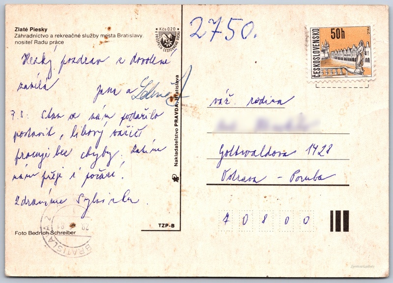 Bratislava, Zlaté Piesky Pokud chcete vidět pohlednice ve vyšším rozlišení nebo zobrazovat jejich zadní stranu, tak se prosím nejdříve přihlašte Přihlásit Zaregistrovat Bratislava Zlaté Piesky Zlaté PieskyZáhradníctvo a rekreačné služby mesta Bratislavy, nositeľ Radu práce Jazyk tištěného textu na pohlednici: slovenština Historické jadro ukázat na mapě Vydavatel: Nakladateľstvo PRAVDA, Bratislava (Československo) Odhadované datum vydání pohlednice: 1978 - 1981 Pomozte nám zpřesnit rok vzniku pohlednice Velikost (š x v) a tvar pohlednice: 147 x 104 mm (5.79" x 4.09"), obdélník Osoby spjaté s touto pohlednicí: Bedrich Schreiber(Autor fotografie) Prošlá poštou:Datum na razítku: 29.6.1981 Ceny: Příplatek na tur. ruch: 0,20 Kčs (CSK))Vyplacené známky: 0,50 Kčs (CSK) DiskuseVložit příspěvek Přidat novou složku ... Spravovat složky ...