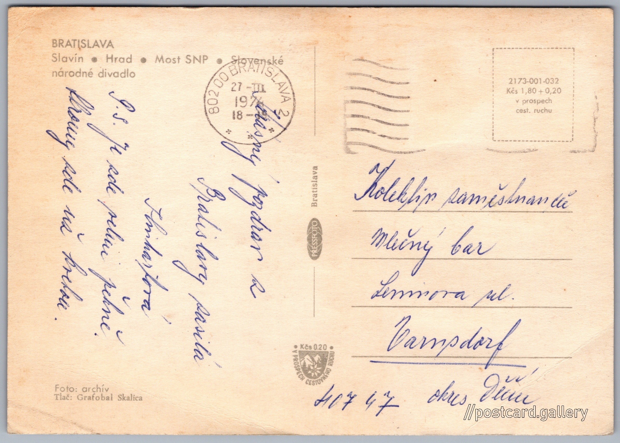 Bratislava Pokud chcete vidět pohlednice ve vyšším rozlišení nebo zobrazovat jejich zadní stranu, tak se prosím nejdříve přihlašte Přihlásit Zaregistrovat BRATISLAVA- Slavín- Hrad- Most SNP- Slovenské národné divadlo Jazyk tištěného textu na pohlednici: slovenština Most Slovenského národního povstání, Ulice, Bratislava, Slovensko ukázat na mapě V blízkém okolí místa zobrazeného na pohlednici lze najít 43 jiných pohlednic. Zobrazit blízké pohlednice Vydavatel: PressFoto Bratislava (Československo) Odhadované datum vydání pohlednice: 1971 - 1974 Pomozte nám zpřesnit rok vzniku pohlednice Velikost (š x v) a tvar pohlednice: 148 x 105 mm (5.83" x 4.13"), obdélník Prošlá poštou:Datum na razítku: 27.3.1974 Ceny: Cena pohlednice: 1,80 Kčs (CSK) (+0,20 Kčs přípl. na tur. ruch) Kódy na pohlednici: 2173-001-032 DiskuseVložit příspěvek Přidat novou složku ... Spravovat složky ...