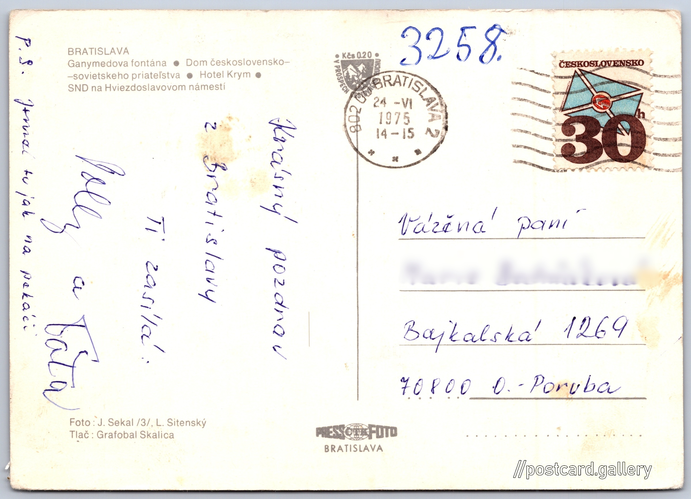 Bratislava Pokud chcete vidět pohlednice ve vyšším rozlišení nebo zobrazovat jejich zadní stranu, tak se prosím nejdříve přihlašte Přihlásit Zaregistrovat Bratislava BRATISLAVA- Ganymedova fontána- Dom československo-sovietskeho priateľstva- Hotel Krym- SND na Hviezdoslavovom námestí Jazyk tištěného textu na pohlednici: slovenština Ganymédova fontána, Kašna, fontána, Bratislava - Staré Mesto, Slovensko ukázat na mapě Vydavatel: PressFoto Bratislava (Československo) Odhadované datum vydání pohlednice: 1972 - 1975 Pomozte nám zpřesnit rok vzniku pohlednice Velikost (š x v) a tvar pohlednice: 148 x 105 mm (5.83" x 4.13"), obdélník Osoby spjaté s touto pohlednicí: Ladislav Sitenský(Autor fotografie) Josef Sekal(Autor fotografie) Prošlá poštou:Datum na razítku: 24.6.1975 Ceny: Příplatek na tur. ruch: 0,20 Kčs (CSK))Vyplacené známky: 0,30 Kčs (CSK) DiskuseVložit příspěvek Přidat novou složku ... Spravovat složky ...