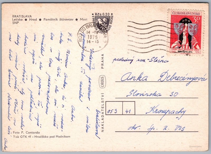 Bratislava Pokud chcete vidět pohlednice ve vyšším rozlišení nebo zobrazovat jejich zadní stranu, tak se prosím nejdříve přihlašte Přihlásit Zaregistrovat Bratislava Bratislava- Letisko- Hrad- Pamätník štúrovcov- most SNP Jazyk tištěného textu na pohlednici: slovenština Letiště Bratislava (BTS), Mezinárodní letiště, Ivanská cesta 4527, Bratislava, Slovensko ukázat na mapě V blízkém okolí místa zobrazeného na pohlednici lze najít 43 jiných pohlednic. Zobrazit blízké pohlednice Vydavatel: Nakladatelství Orbis (Československo) Odhadované datum vydání pohlednice: 1972 - 1975 Pomozte nám zpřesnit rok vzniku pohlednice Velikost (š x v) a tvar pohlednice: 149 x 106 mm (5.87" x 4.17"), obdélník Osoby spjaté s touto pohlednicí: Pavol Contardo(Autor fotografie) Ľudovít Štúr(Obsah pohlednice) Prošlá poštou:Datum na razítku: 14.4.1975Datum napsání pohledu: 14.4.1975 Ceny: Příplatek na tur. ruch: 0,20 Kčs (CSK))Vyplacené známky: 0,30 Kčs (CSK) DiskuseVložit příspěvek Přidat novou složku ... Spravovat složky ...