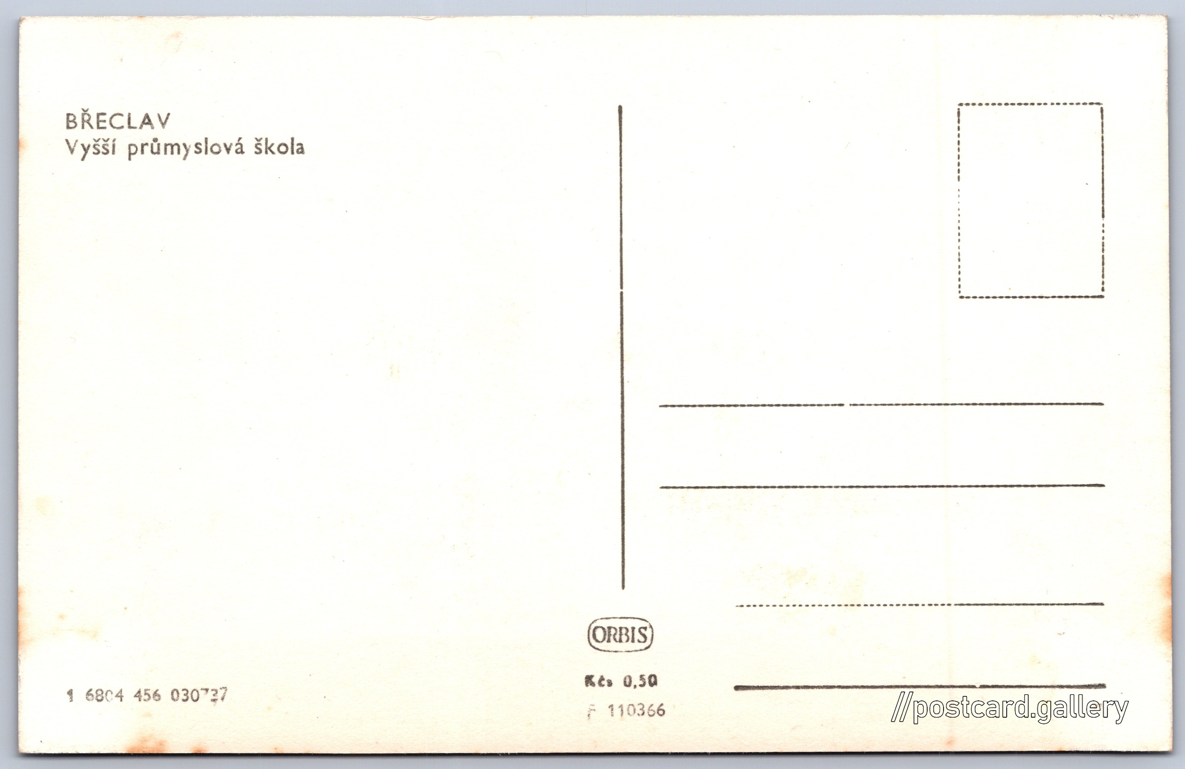 Břeclav, Vyšší průmyslová škola Pokud chcete vidět pohlednice ve vyšším rozlišení nebo zobrazovat jejich zadní stranu, tak se prosím nejdříve přihlašte Přihlásit Zaregistrovat BŘECLAVVyšší průmyslová škola Jazyk tištěného textu na pohlednici: čeština nábř. Komenského 1126/1, Břeclav, 690 02, Břeclav ukázat na mapě Vydavatel: Nakladatelství Orbis (Československo) Rok vydání pohlednice: duben, 1956 Velikost (š x v) a tvar pohlednice: 139 x 89 mm (5.47" x 3.50"), obdélník Čistá pohlednice (neprošlá poštou) Ceny: Cena pohlednice: 0,50 Kčs (CSK) Kódy na pohlednici: 1 6804 456 030727 F 110366 DiskuseVložit příspěvek Přidat novou složku ... Spravovat složky ...