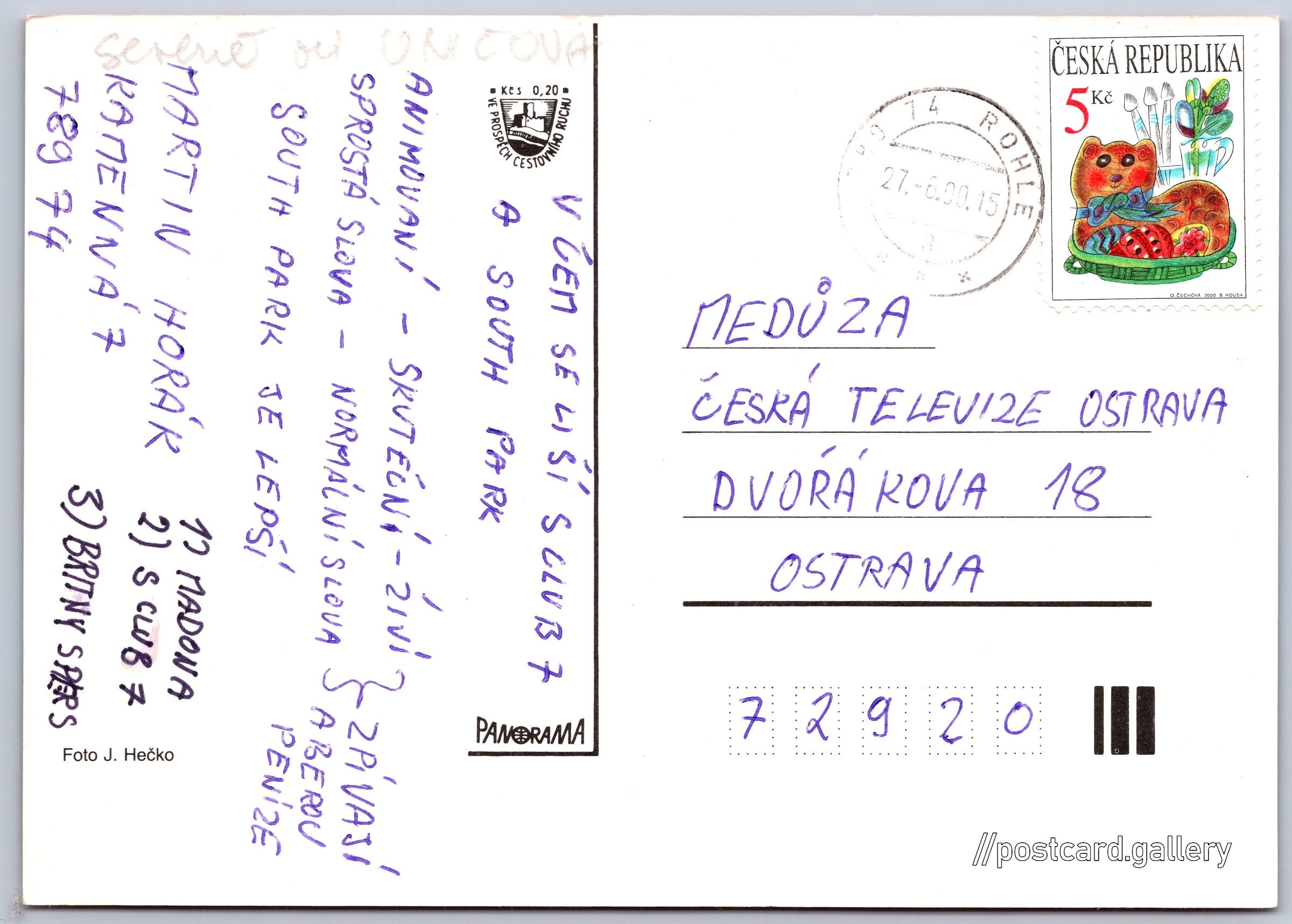 Brníčko, Kamenná, Libina, Rohle Pokud chcete vidět pohlednice ve vyšším rozlišení nebo zobrazovat jejich zadní stranu, tak se prosím nejdříve přihlašte Přihlásit Zaregistrovat Brníčko, Kamenná, Libina, Rohle Jazyk tištěného textu na pohlednici: čeština Brníčko, Obec, Česko ukázat na mapě Vydavatel: Panorama (Československo) Odhadované datum vydání pohlednice: 1997 - 2000 Pomozte nám zpřesnit rok vzniku pohlednice Velikost (š x v) a tvar pohlednice: 148 x 105 mm (5.83" x 4.13"), obdélník Osoby spjaté s touto pohlednicí: J. Hečko(Autor fotografie) Prošlá poštou:Datum na razítku: 27.6.2000 Ceny: Příplatek na tur. ruch: 0,20 Kčs (CSK))Vyplacené známky: 5,00 Kč (CZK) DiskuseVložit příspěvek Přidat novou složku ... Spravovat složky ...