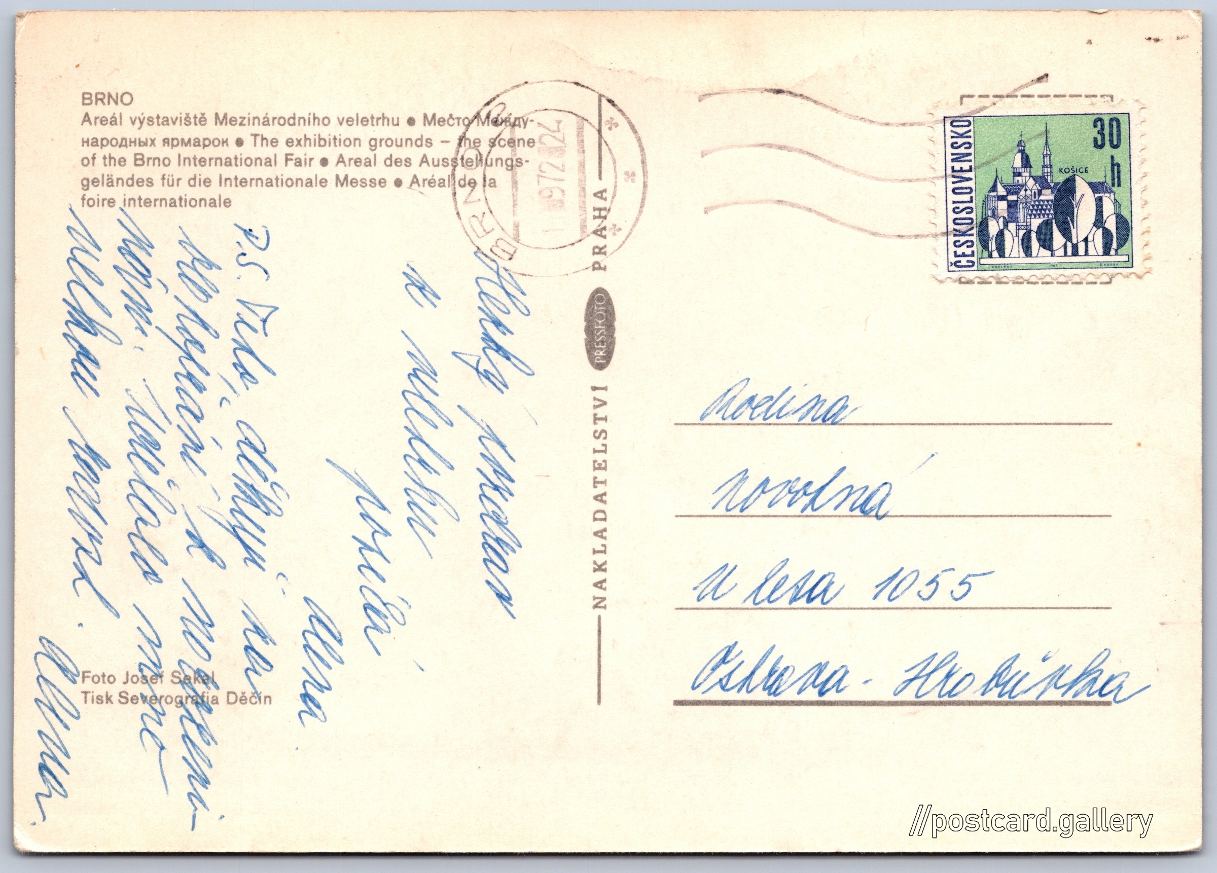 Brno, areál výstaviště Pokud chcete vidět pohlednice ve vyšším rozlišení nebo zobrazovat jejich zadní stranu, tak se prosím nejdříve přihlašte Přihlásit Zaregistrovat BRNO- Areál výstaviště Mezinárodního veletrhu- Mecto Mexayнародныx ярмарox- The exhibition grounds - the scene of the Brno International Fair - - -- Areal des Ausstellungsgeländes für die Internationale Messe- Aréal de la foire internationale Jazyk tištěného textu na pohlednici: čeština Brno-střed, Brno, Brno-město ukázat na mapě V blízkém okolí místa zobrazeného na pohlednici lze najít 39 jiných pohlednic. Zobrazit blízké pohlednice Vydavatel: PressFoto Praha (Československo) Odhadované datum vydání pohlednice: 1969 - 1972 Pomozte nám zpřesnit rok vzniku pohlednice Velikost (š x v) a tvar pohlednice: 148 x 104 mm (5.83" x 4.09"), obdélník Osoby spjaté s touto pohlednicí: Josef Sekal(Autor fotografie) Prošlá poštou:Datum na razítku: 11.9.1972 Ceny: Vyplacené známky: 0,30 Kčs (CSK) DiskuseVložit příspěvek Přidat novou složku ... Spravovat složky ...