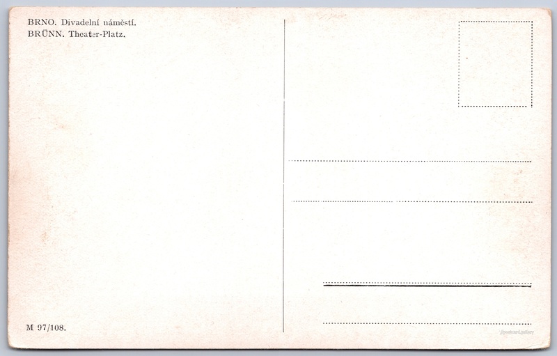 Brno, Divadelní náměstí Pokud chcete vidět pohlednice ve vyšším rozlišení nebo zobrazovat jejich zadní stranu, tak se prosím nejdříve přihlašte Přihlásit Zaregistrovat BRNO. Divadelní náměstí.BRÜNN. Theater-Platz. Jazyky tištěného textu na pohlednici: čeština, němčina Rooseveltova, Brno, Brno-město ukázat na mapě V blízkém okolí místa zobrazeného na pohlednici lze najít 39 jiných pohlednic. Zobrazit blízké pohlednice Datum vydání není známo Pomozte nám odhadnout datum vzniku pohlednice Velikost (š x v) a tvar pohlednice: 140 x 89 mm (5.51" x 3.50"), obdélník Čistá pohlednice (neprošlá poštou) Kódy na pohlednici: M 97/108 DiskuseVložit příspěvek Přidat novou složku ... Spravovat složky ...