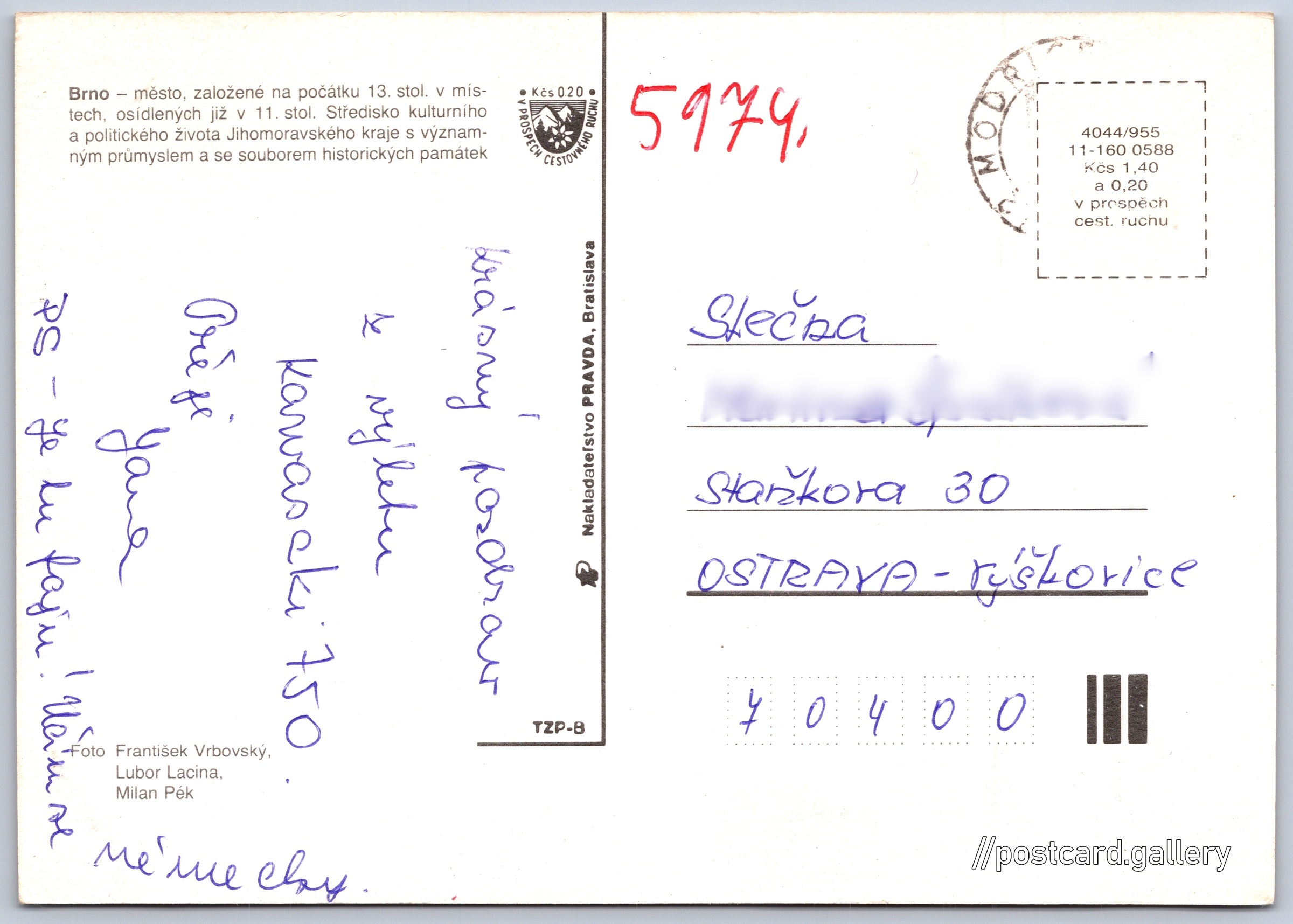 Brno 2/7 Pokud chcete vidět pohlednice ve vyšším rozlišení nebo zobrazovat jejich zadní stranu, tak se prosím nejdříve přihlašte Přihlásit Zaregistrovat Brno Brno - město, založené na počátku 13. stol. v místech, osídlených již v 11. stol. Středisko kulturního a politického života Jihomoravského kraje s významným průmyslem a se souborem historických památek. Jazyk tištěného textu na pohlednici: čeština Mendlovo náměstí, Brno, Brno-město ukázat na mapě Vydavatel: Nakladateľstvo PRAVDA, Bratislava (Československo) Rok vydání pohlednice: květen, 1988 Velikost (š x v) a tvar pohlednice: 149 x 106 mm (5.87" x 4.17"), obdélník Osoby spjaté s touto pohlednicí: František Vrbovský(Autor fotografie) Lubor Lacina(Autor fotografie) Milan Pék(Autor fotografie) Prošlá poštou Ceny: Cena pohlednice: 1,40 Kčs (CSK) (+0,20 Kčs přípl. na tur. ruch) Kódy na pohlednici: 4044/955 11-160 0588 DiskuseVložit příspěvek Přidat novou složku ... Spravovat složky ...
