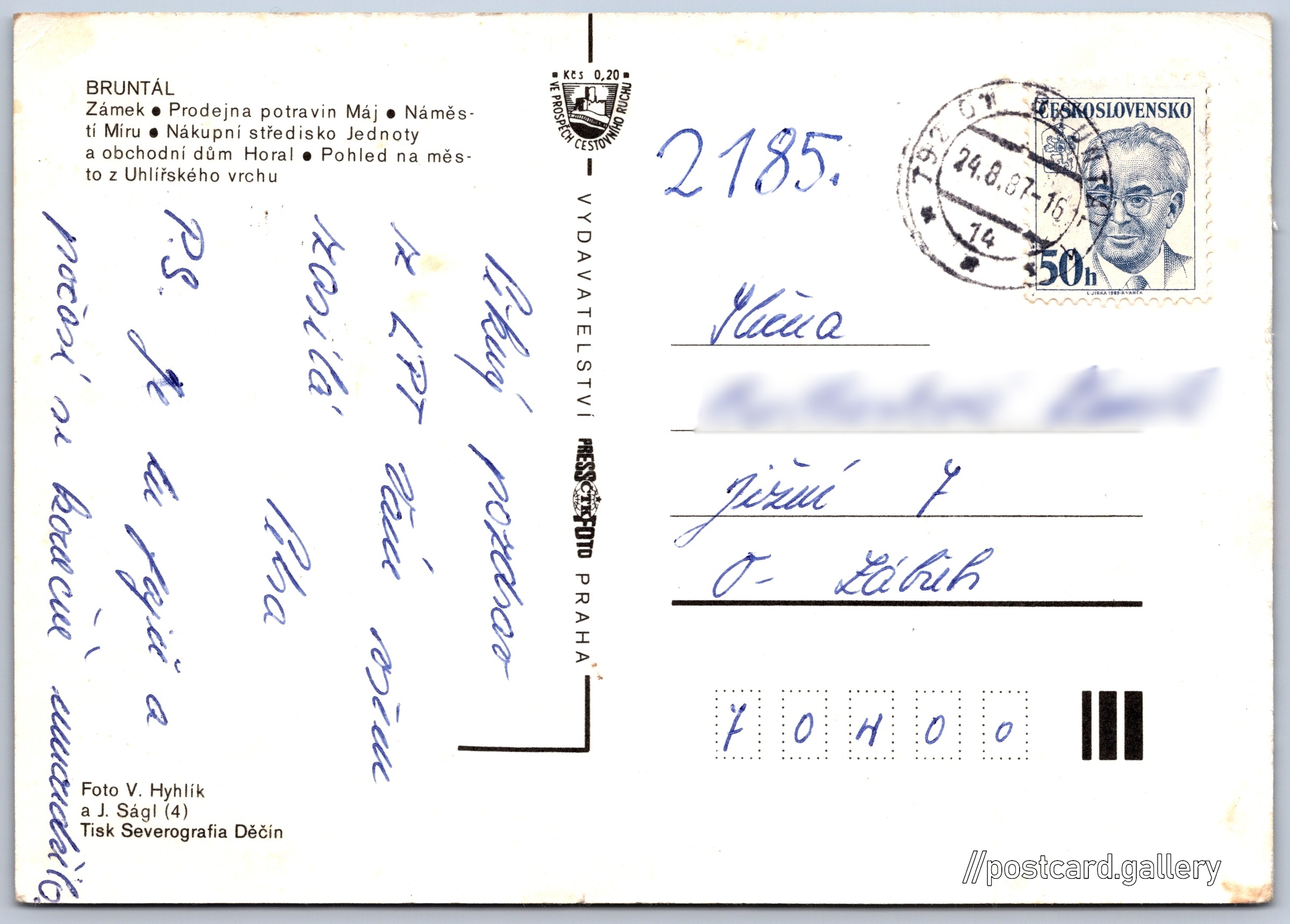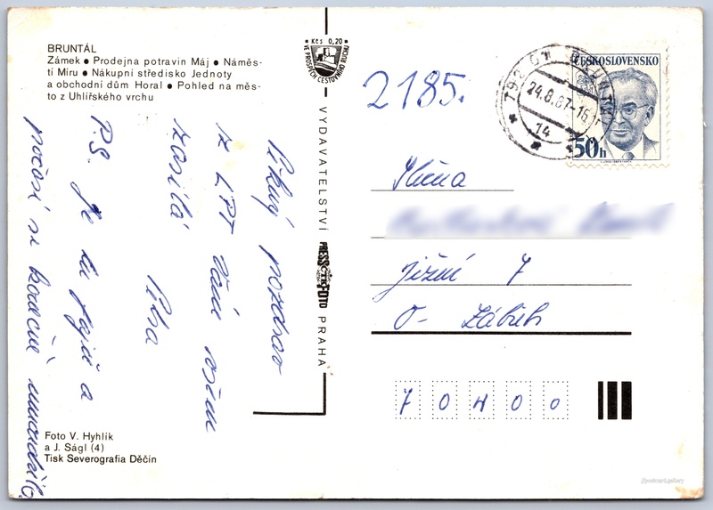 Bruntál Pokud chcete vidět pohlednice ve vyšším rozlišení nebo zobrazovat jejich zadní stranu, tak se prosím nejdříve přihlašte Přihlásit Zaregistrovat Bruntál BRUNTÁL- Zámek- Prodejna potravin Máj- Náměstí Míru- Nákupní středisko Jednoty a obchodní dům Horal- Pohled na město z Uhlířského vrchu Jazyk tištěného textu na pohlednici: čeština Bruntál, Bruntál ukázat na mapě Vydavatel: PressFoto Praha (Československo) Odhadované datum vydání pohlednice: 1984 - 1987 Pomozte nám zpřesnit rok vzniku pohlednice Velikost (š x v) a tvar pohlednice: 148 x 104 mm (5.83" x 4.09"), obdélník Osoby spjaté s touto pohlednicí: Jan Ságl(Autor fotografie) Vladimír Hyhlík(Autor fotografie) Prošlá poštou:Datum na razítku: 24.8.1987 Ceny: Příplatek na tur. ruch: 0,20 Kčs (CSK))Vyplacené známky: 0,50 Kčs (CSK) DiskuseVložit příspěvek Přidat novou složku ... Spravovat složky ...