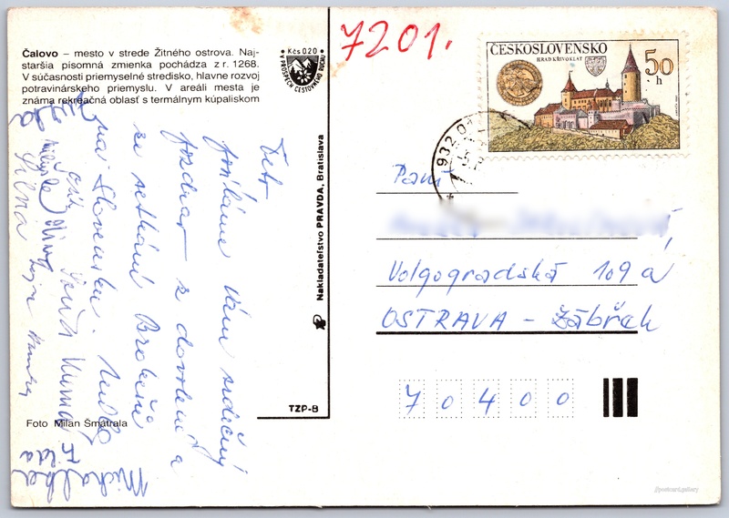 Čalovo Pokud chcete vidět pohlednice ve vyšším rozlišení nebo zobrazovat jejich zadní stranu, tak se prosím nejdříve přihlašte Přihlásit Zaregistrovat Čalovo Čalovo - mesto v strede Žitného ostrova. Najstaršia písomná zmienka pochádza z r. 1268. V súčasnosti priemyselné stredisko, hlavne rozvoj potravinárskeho priemyslu. V areáli mesta jeznáma rekreačná oblasť s termálnym kúpaliskom Jazyk tištěného textu na pohlednici: slovenština Námestie Bélu Bartóka ukázat na mapě Vydavatel: Nakladateľstvo PRAVDA, Bratislava (Československo) Datum vydání není známo Pomozte nám odhadnout datum vzniku pohlednice Velikost (š x v) a tvar pohlednice: 149 x 105 mm (5.87" x 4.13"), obdélník Osoby spjaté s touto pohlednicí: Milan Šmátrala(Autor fotografie) Prošlá poštou Ceny: Příplatek na tur. ruch: 0,20 Kčs (CSK))Vyplacené známky: 0,50 Kčs (CSK) DiskuseVložit příspěvek Přidat novou složku ... Spravovat složky ...