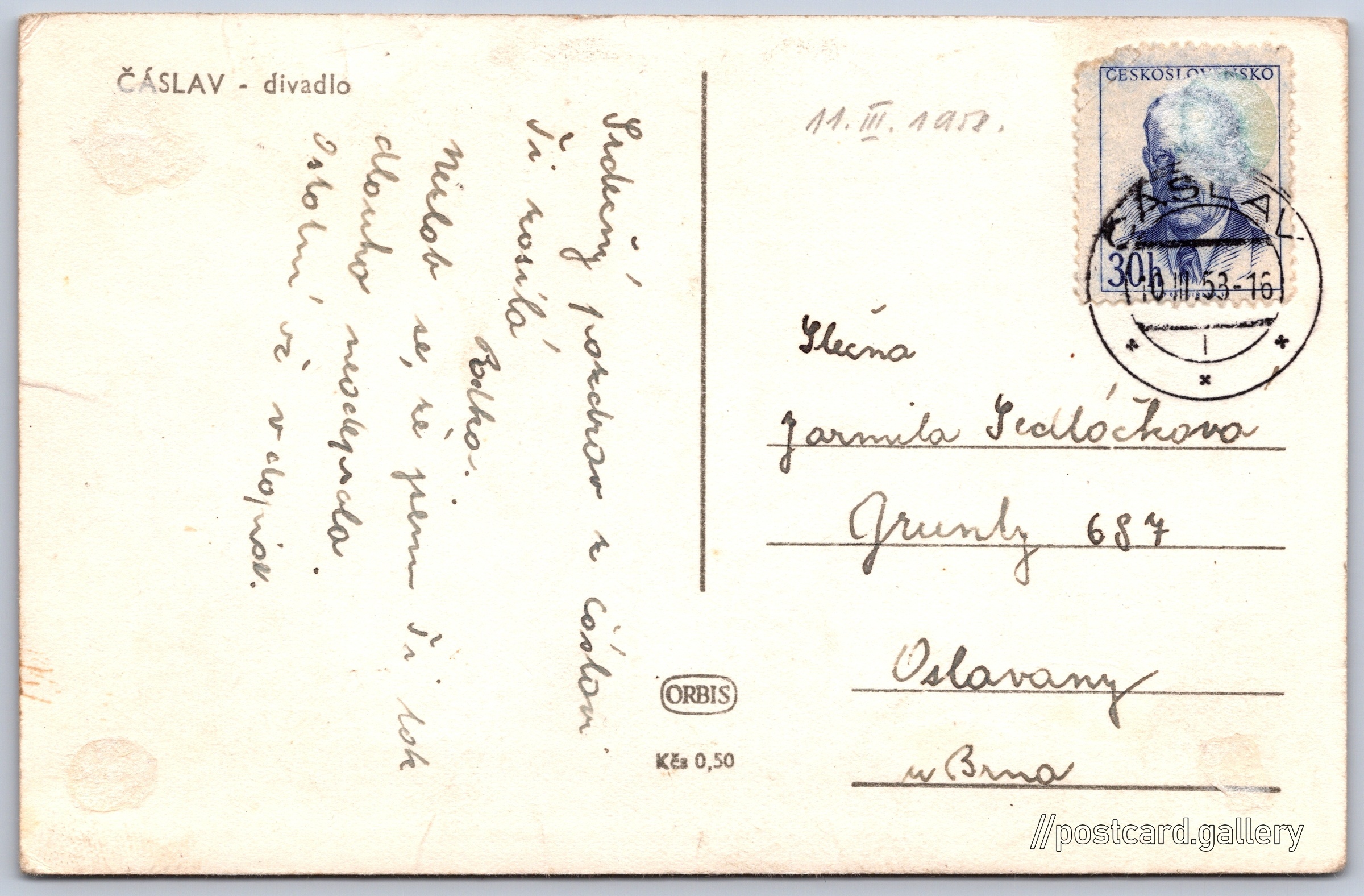 Čáslav, divadlo Pokud chcete vidět pohlednice ve vyšším rozlišení nebo zobrazovat jejich zadní stranu, tak se prosím nejdříve přihlašte Přihlásit Zaregistrovat ČÁSLAV - divadlo Jazyk tištěného textu na pohlednici: čeština Dusíkovo divadlo Čáslav, Masarykova 194/36, Čáslav-Nové Město, Česko ukázat na mapě V blízkém okolí místa zobrazeného na pohlednici lze najít 2 jiné pohlednice. Zobrazit blízké pohlednice Vydavatel: Nakladatelství Orbis (Československo) Odhadované datum vydání pohlednice: 1955 - 1958 Pomozte nám zpřesnit rok vzniku pohlednice Velikost (š x v) a tvar pohlednice: 138 x 89 mm (5.43" x 3.50"), obdélník Prošlá poštou:Datum na razítku: 10.3.1958 Ceny: Cena pohlednice: 0,50 Kčs (CSK)Vyplacené známky: 0,30 Kčs (CSK) DiskuseVložit příspěvek Přidat novou složku ... Spravovat složky ...