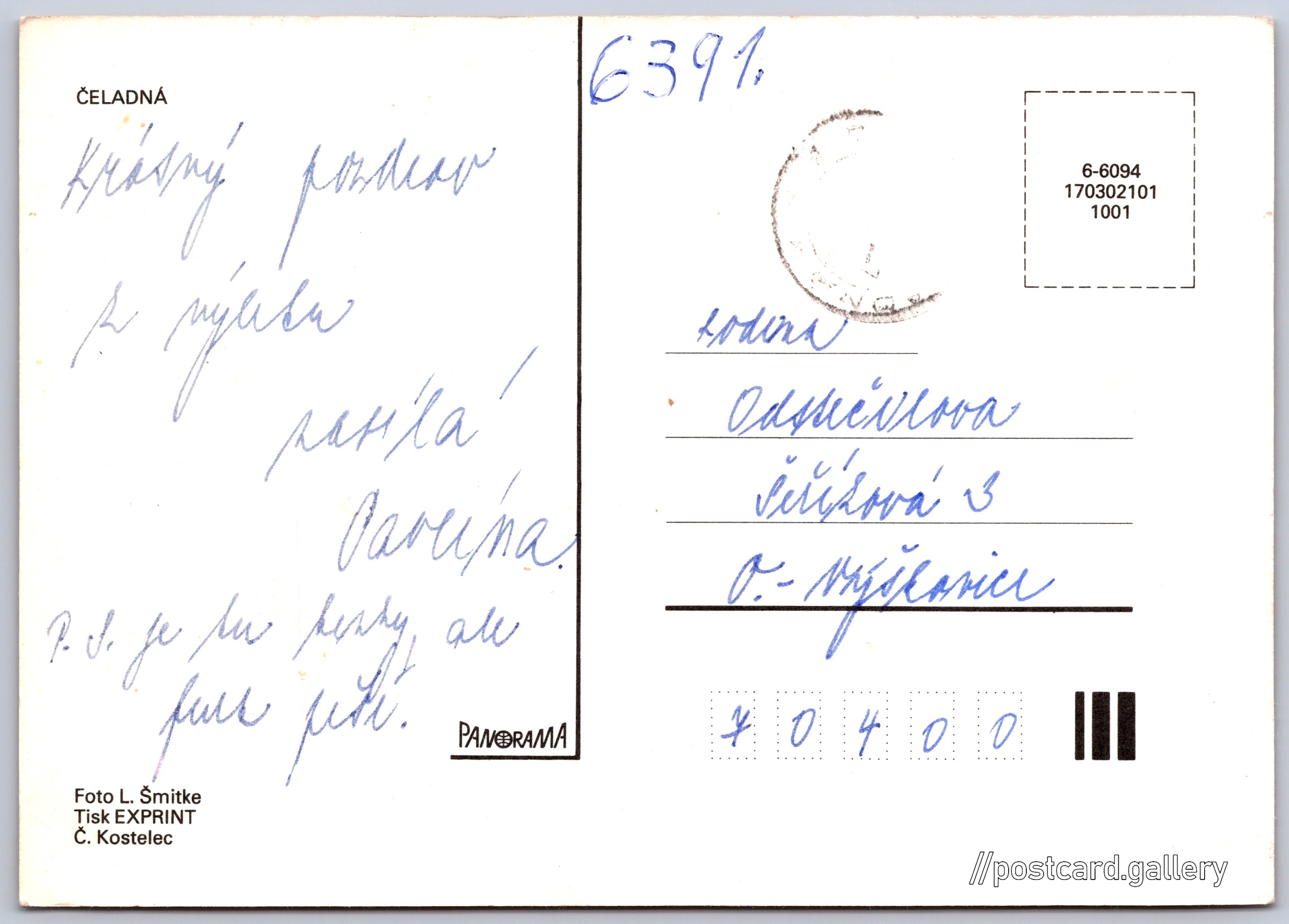 Čeladná Pokud chcete vidět pohlednice ve vyšším rozlišení nebo zobrazovat jejich zadní stranu, tak se prosím nejdříve přihlašte Přihlásit Zaregistrovat Čeladná ČELADNÁ Jazyk tištěného textu na pohlednici: čeština Čeladná, Obec, Česko ukázat na mapě V blízkém okolí místa zobrazeného na pohlednici lze najít 16 jiných pohlednic. Zobrazit blízké pohlednice Vydavatel: Panorama (Československo) Datum vydání není známo Pomozte nám odhadnout datum vzniku pohlednice Velikost (š x v) a tvar pohlednice: 148 x 105 mm (5.83" x 4.13"), obdélník Osoby spjaté s touto pohlednicí: L. Šmitke(Autor fotografie) Prošlá poštou Kódy na pohlednici: 6-6094 170302101 1001 DiskuseVložit příspěvek Přidat novou složku ... Spravovat složky ...
