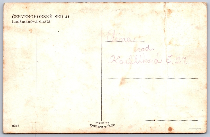 Červenohorské sedlo, Laušmanova chata Pokud chcete vidět pohlednice ve vyšším rozlišení nebo zobrazovat jejich zadní stranu, tak se prosím nejdříve přihlašte Přihlásit Zaregistrovat ČERVENOHORSKÉ SEDLOLaušmanova chata Jazyk tištěného textu na pohlednici: čeština Kouty nad Desnou, Loučná nad Desnou, Šumperk ukázat na mapě Vydavatel: Fototypia - Vyškov (Československo) Datum vydání není známo Pomozte nám odhadnout datum vzniku pohlednice Velikost (š x v) a tvar pohlednice: 137 x 89 mm (5.39" x 3.50"), obdélník Čistá pohlednice (neprošlá poštou) Kódy na pohlednici: 9247 DiskuseVložit příspěvek Přidat novou složku ... Spravovat složky ...