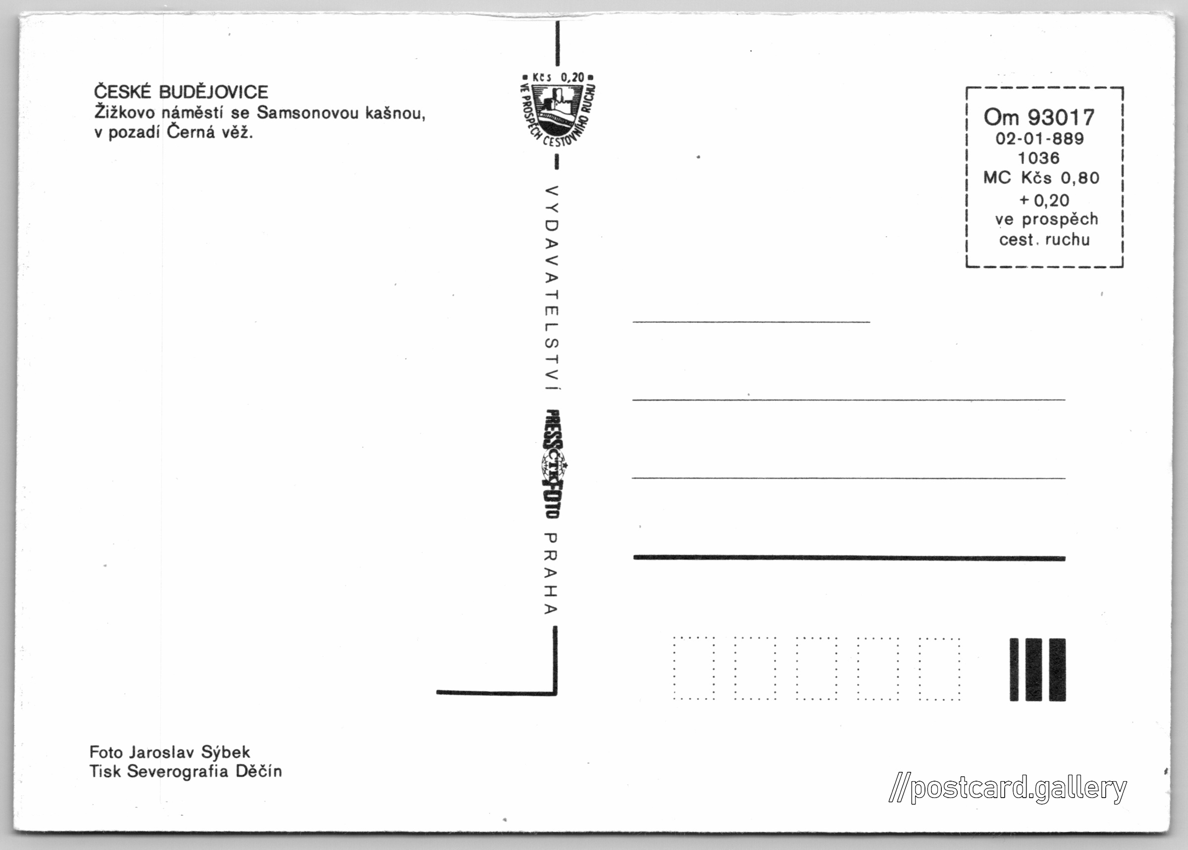 České Budějovice, Samsonova kašna Pokud chcete vidět pohlednice ve vyšším rozlišení nebo zobrazovat jejich zadní stranu, tak se prosím nejdříve přihlašte Přihlásit Zaregistrovat ČESKÉ BUDĚJOVICEŽižkovo náměstí se Samsonovou kašnou, v pozadí Černá věž. Jazyk tištěného textu na pohlednici: čeština Samsonova kašna, Kašna, fontána, České Budějovice 1, Česko ukázat na mapě V blízkém okolí místa zobrazeného na pohlednici lze najít 8 jiných pohlednic. Zobrazit blízké pohlednice Vydavatel: PressFoto Praha (Československo) Rok vydání pohlednice: 1988 Velikost (š x v) a tvar pohlednice: 149 x 105 mm (5.87" x 4.13"), obdélník Osoby spjaté s touto pohlednicí: Jaroslav Sýbek(Autor fotografie) Čistá pohlednice (neprošlá poštou) Ceny: Cena pohlednice: 0,80 Kčs (CSK) (+0,20 Kčs přípl. na tur. ruch) Kódy na pohlednici: Om 93017 02-01-889 1036 DiskuseVložit příspěvek Přidat novou složku ... Spravovat složky ...
