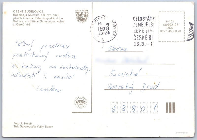 České Budějovice Pokud chcete vidět pohlednice ve vyšším rozlišení nebo zobrazovat jejich zadní stranu, tak se prosím nejdříve přihlašte Přihlásit Zaregistrovat České Budějovice ČESKÉ BUDĚJOVICE- Radnice- Muzeum děl. rev. hnutí jižních Čech- Rabenštejnská věž- Solnice a tržiště- Samsonova kašna a Černá věž Jazyk tištěného textu na pohlednici: čeština nám. Přemysla Otakara II. 2/2, České Budějovice, 370 01, České Budějovice ukázat na mapě Vydavatel: Nakladatelství Orbis (Československo) Odhadované datum vydání pohlednice: 1975 - 1978 Pomozte nám zpřesnit rok vzniku pohlednice Velikost (š x v) a tvar pohlednice: 148 x 103 mm (5.83" x 4.06"), obdélník Osoby spjaté s touto pohlednicí: Antonín Holub(Autor fotografie) Prošlá poštou:Datum na razítku: 19.6.1978 Ceny: Cena pohlednice: 1,40 Kčs (CSK) (+0,20 Kčs přípl. na tur. ruch) Kódy na pohlednici: 6-151 120302101 8033 DiskuseVložit příspěvek Přidat novou složku ... Spravovat složky ...