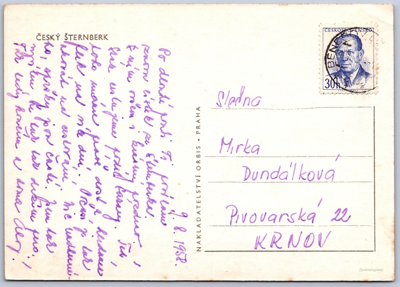 Český Šternberk Pokud chcete vidět pohlednice ve vyšším rozlišení nebo zobrazovat jejich zadní stranu, tak se prosím nejdříve přihlašte Přihlásit Zaregistrovat ČESKÝ ŠTERNBERK Jazyk tištěného textu na pohlednici: čeština Český Šternberk, Městys, Česko ukázat na mapě V blízkém okolí místa zobrazeného na pohlednici lze najít 10 jiných pohlednic. Zobrazit blízké pohlednice Vydavatel: Nakladatelství Orbis (Československo) Odhadované datum vydání pohlednice: 1955 - 1958 Pomozte nám zpřesnit rok vzniku pohlednice Velikost (š x v) a tvar pohlednice: 146 x 103 mm (5.75" x 4.06"), obdélník Prošlá poštou:Datum na razítku: 9.8.1958Datum napsání pohledu: 9.8.1958 Ceny: Vyplacené známky: 0,30 Kčs (CSK) DiskuseVložit příspěvek Přidat novou složku ... Spravovat složky ...
