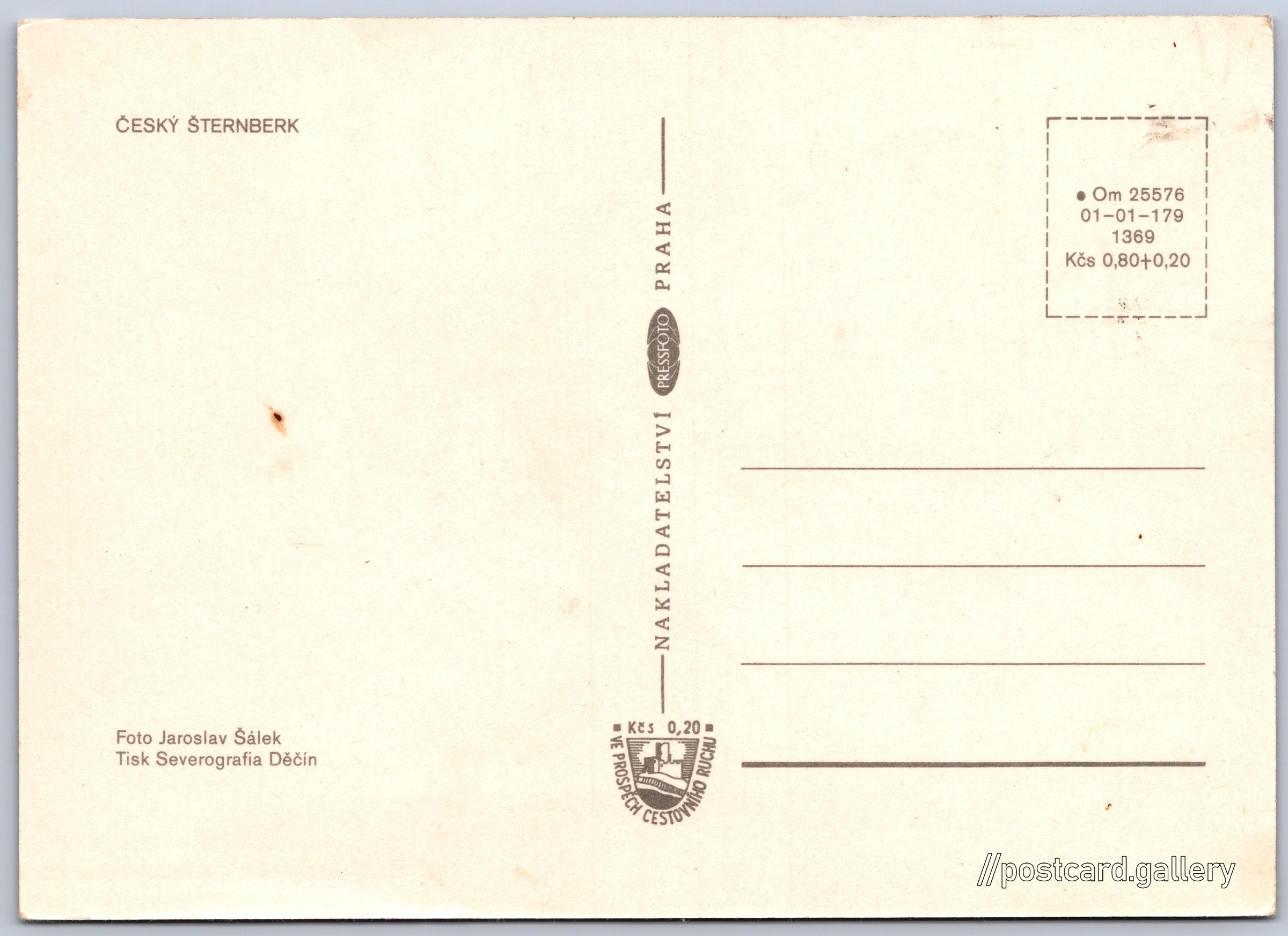 Cena pohlednice: 0,80 Kčs (CSK) (+0,20 Kčs přípl. na tur. ruch)