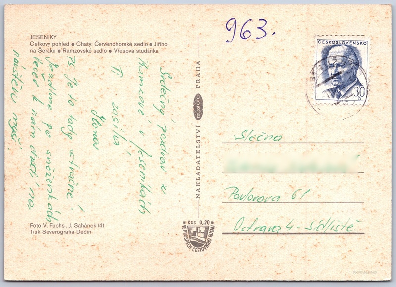 Chaty RaJ Jeseník Pokud chcete vidět pohlednice ve vyšším rozlišení nebo zobrazovat jejich zadní stranu, tak se prosím nejdříve přihlašte Přihlásit Zaregistrovat Chaty RaJ Jeseník JESENÍKY- Celkový pohled- Chaty: Červenohorské sedlo- Jiřího na Šeráku- Ramzovské sedlo- Vřesová studánka Jazyk tištěného textu na pohlednici: čeština Kouty nad Desnou, Loučná nad Desnou, Šumperk ukázat na mapě Vydavatel: PressFoto Praha (Československo) Odhadované datum vydání pohlednice: 1969 - 1972 Pomozte nám zpřesnit rok vzniku pohlednice Velikost (š x v) a tvar pohlednice: 148 x 105 mm (5.83" x 4.13"), obdélník Osoby spjaté s touto pohlednicí: Jaromír Sahánek(Autor fotografie) Václav Fuchs(Autor fotografie) Prošlá poštou:Datum na razítku: 1.3.1972 Ceny: Příplatek na tur. ruch: 0,20 Kčs (CSK))Vyplacené známky: 0,30 Kčs (CSK) DiskuseVložit příspěvek Přidat novou složku ... Spravovat složky ...