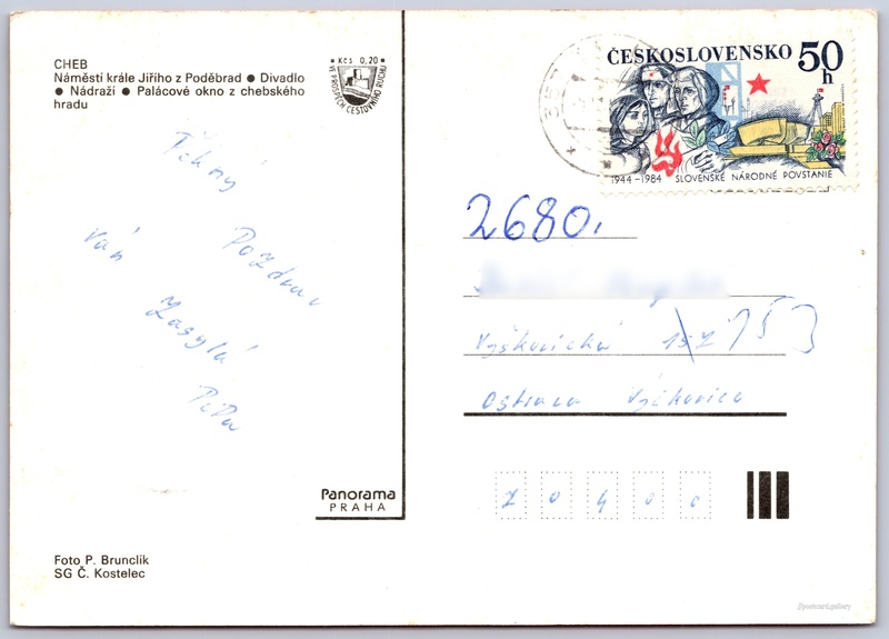 Cheb Pokud chcete vidět pohlednice ve vyšším rozlišení nebo zobrazovat jejich zadní stranu, tak se prosím nejdříve přihlašte Přihlásit Zaregistrovat Cheb CHEB- Náměstí krále Jiřího z Poděbrad- Divadlo- Nádraží- Palácové okno z chebského hradu Jazyk tištěného textu na pohlednici: čeština náměstí Krále Jiřího z Poděbrad, Náměstí, Cheb, Česko ukázat na mapě Vydavatel: Panorama (Československo) Odhadované datum vydání pohlednice: 1982 - 1984 Pomozte nám zpřesnit rok vzniku pohlednice Velikost (š x v) a tvar pohlednice: 148 x 105 mm (5.83" x 4.13"), obdélník Osoby spjaté s touto pohlednicí: P. Brunclík(Autor fotografie) Prošlá poštou Ceny: Příplatek na tur. ruch: 0,20 Kčs (CSK))Vyplacené známky: 0,50 Kčs (CSK) DiskuseVložit příspěvek Přidat novou složku ... Spravovat složky ...