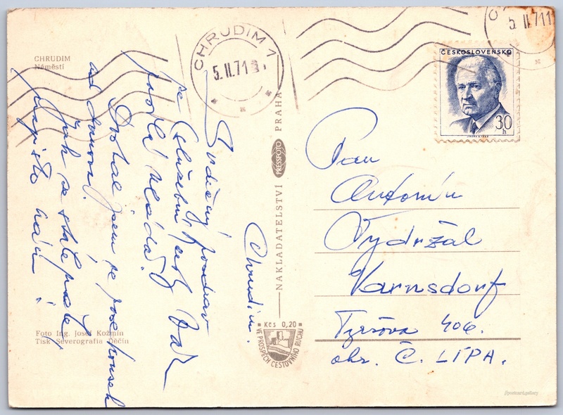 Chrudim, náměstí Pokud chcete vidět pohlednice ve vyšším rozlišení nebo zobrazovat jejich zadní stranu, tak se prosím nejdříve přihlašte Přihlásit Zaregistrovat CHRUDIMNáměstí Jazyk tištěného textu na pohlednici: čeština Resselovo náměstí, Chrudim, Chrudim ukázat na mapě Vydavatel: PressFoto Praha (Československo) Odhadované datum vydání pohlednice: 1968 - 1971 Pomozte nám zpřesnit rok vzniku pohlednice Velikost (š x v) a tvar pohlednice: 144 x 105 mm (5.67" x 4.13"), obdélník Osoby spjaté s touto pohlednicí: Ing. Josef Kožmín(Autor fotografie) Prošlá poštou:Datum na razítku: 5.2.1971 Ceny: Příplatek na tur. ruch: 0,20 Kčs (CSK))Vyplacené známky: 0,30 Kčs (CSK) DiskuseVložit příspěvek Přidat novou složku ... Spravovat složky ...