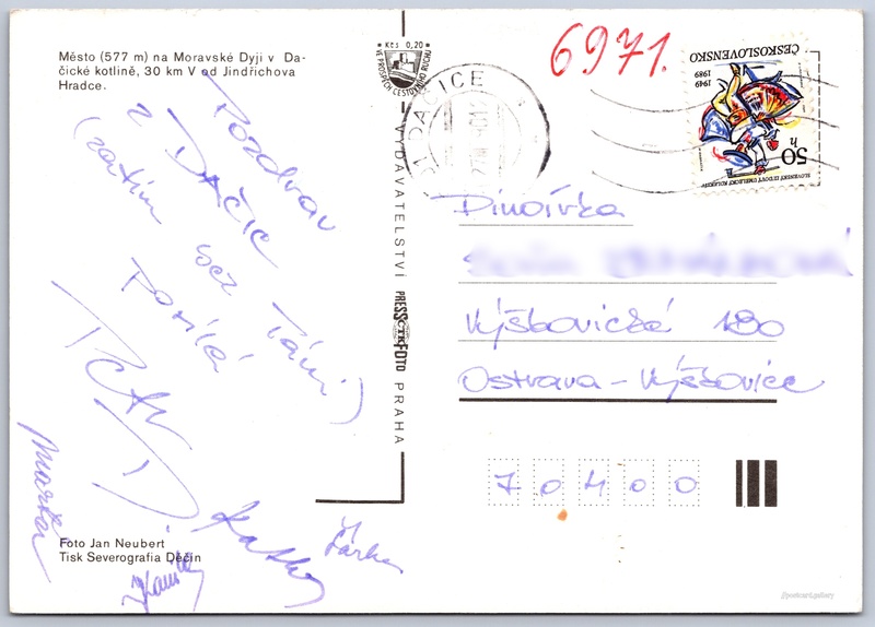 Dačice Pokud chcete vidět pohlednice ve vyšším rozlišení nebo zobrazovat jejich zadní stranu, tak se prosím nejdříve přihlašte Přihlásit Zaregistrovat Dačice Město (577 m) na Moravské Dyji v Dačické kotlině, 30 km V od Jindřichova Hradce. Jazyk tištěného textu na pohlednici: čeština Palackého nám., Dačice, Jindřichův Hradec ukázat na mapě Vydavatel: PressFoto Praha (Československo) Datum vydání není známo Pomozte nám odhadnout datum vzniku pohlednice Velikost (š x v) a tvar pohlednice: 148 x 105 mm (5.83" x 4.13"), obdélník Osoby spjaté s touto pohlednicí: Jan Neubert(Autor fotografie) Prošlá poštou Ceny: Příplatek na tur. ruch: 0,20 Kčs (CSK))Vyplacené známky: 0,50 Kčs (CSK) DiskuseVložit příspěvek Přidat novou složku ... Spravovat složky ...