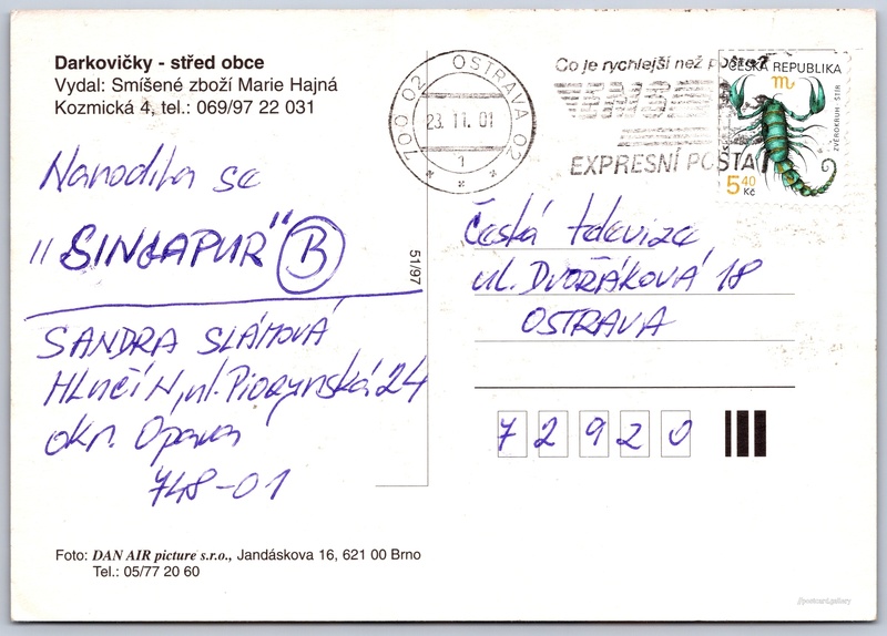 Darkovičky, střed obce Pokud chcete vidět pohlednice ve vyšším rozlišení nebo zobrazovat jejich zadní stranu, tak se prosím nejdříve přihlašte Přihlásit Zaregistrovat Darkovičky Darkovičky - střed obceVydal: Smíšené zboží Marie HajnáKozmická 4, tel.: 069/97 22 031 Jazyk tištěného textu na pohlednici: čeština Kozmická 210/4, Hlučín, 748 01, Opava ukázat na mapě Vydavatel: DAN AIR picture (Česko) Rok vydání pohlednice: 1997 Velikost (š x v) a tvar pohlednice: 149 x 105 mm (5.87" x 4.13"), obdélník Prošlá poštou:Datum na razítku: 23.11.2001 Ceny: Vyplacené známky: 5,40 Kč (CZK) Kódy na pohlednici: 51/97 DiskuseVložit příspěvek Přidat novou složku ... Spravovat složky ...