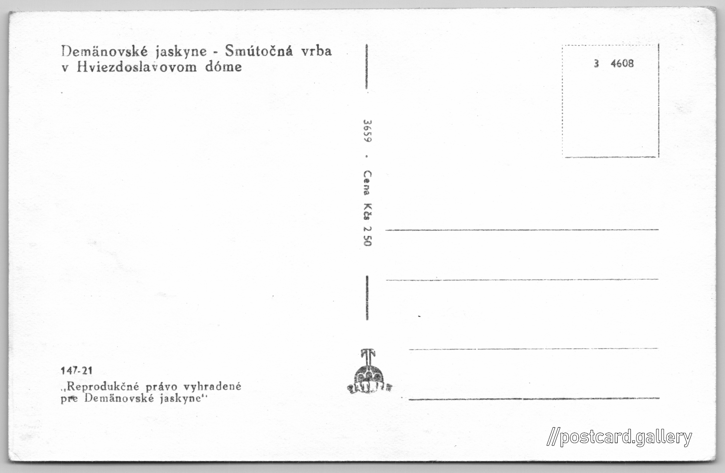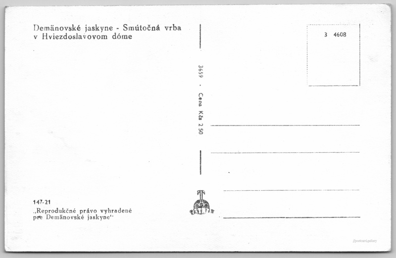 Demänovské jeskyně, smuteční vrba Pokud chcete vidět pohlednice ve vyšším rozlišení nebo zobrazovat jejich zadní stranu, tak se prosím nejdříve přihlašte Přihlásit Zaregistrovat Demänovské jaskyne - Smútočná vrbaHviezdoslavovom dóme Jazyk tištěného textu na pohlednici: slovenština Demänovská jeskyně svobody, Jeskyně, Demänovská Dolina 27, Demänovská Dolina, Slovensko ukázat na mapě V blízkém okolí místa zobrazeného na pohlednici lze najít 29 jiných pohlednic. Zobrazit blízké pohlednice Vydavatel: Tatran (Československo) Datum vydání není známo Pomozte nám odhadnout datum vzniku pohlednice Velikost (š x v) a tvar pohlednice: 138 x 89 mm (5.43" x 3.50"), obdélník Čistá pohlednice (neprošlá poštou) Ceny: Cena pohlednice: 2,50 Kčs (CSK) Kódy na pohlednici: 147-21 3659 3 4608 DiskuseVložit příspěvek Přidat novou složku ... Spravovat složky ...