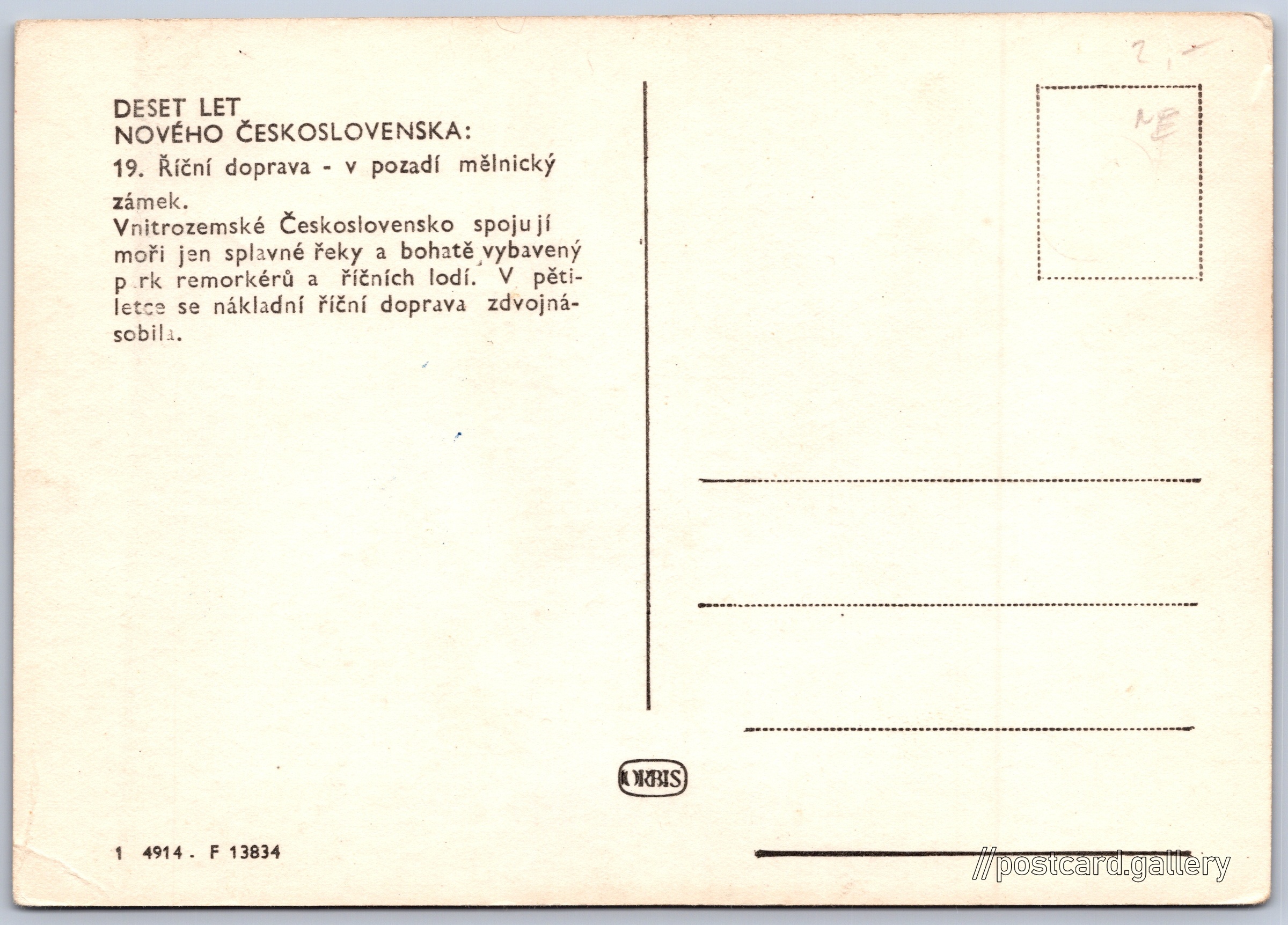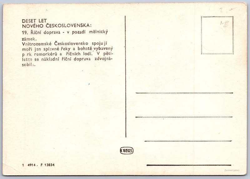 Deset let nového Československa, říční doprava Pokud chcete vidět pohlednice ve vyšším rozlišení nebo zobrazovat jejich zadní stranu, tak se prosím nejdříve přihlašte Přihlásit Zaregistrovat DESET LET NOVÉHO ČESKOSLOVENSKA:19. Říční doprava - v pozadí mělnický zámek.Vnitrozemské Československo spojují moři jen splavné řeky a bohatě vybavený park remorkérů a říčních lodí. V pětiletce se nákladní říční doprava zdvojnásobila. Jazyk tištěného textu na pohlednici: čeština Zámek Mělník, Zámek, Svatováclavská 19/16, Mělník, Česko ukázat na mapě Vydavatel: Nakladatelství Orbis (Československo) Rok vydání pohlednice: 1958 Velikost (š x v) a tvar pohlednice: 146 x 102 mm (5.75" x 4.02"), obdélník Čistá pohlednice (neprošlá poštou) Kódy na pohlednici: 1 4914 F 13834 DiskuseVložit příspěvek Přidat novou složku ... Spravovat složky ...