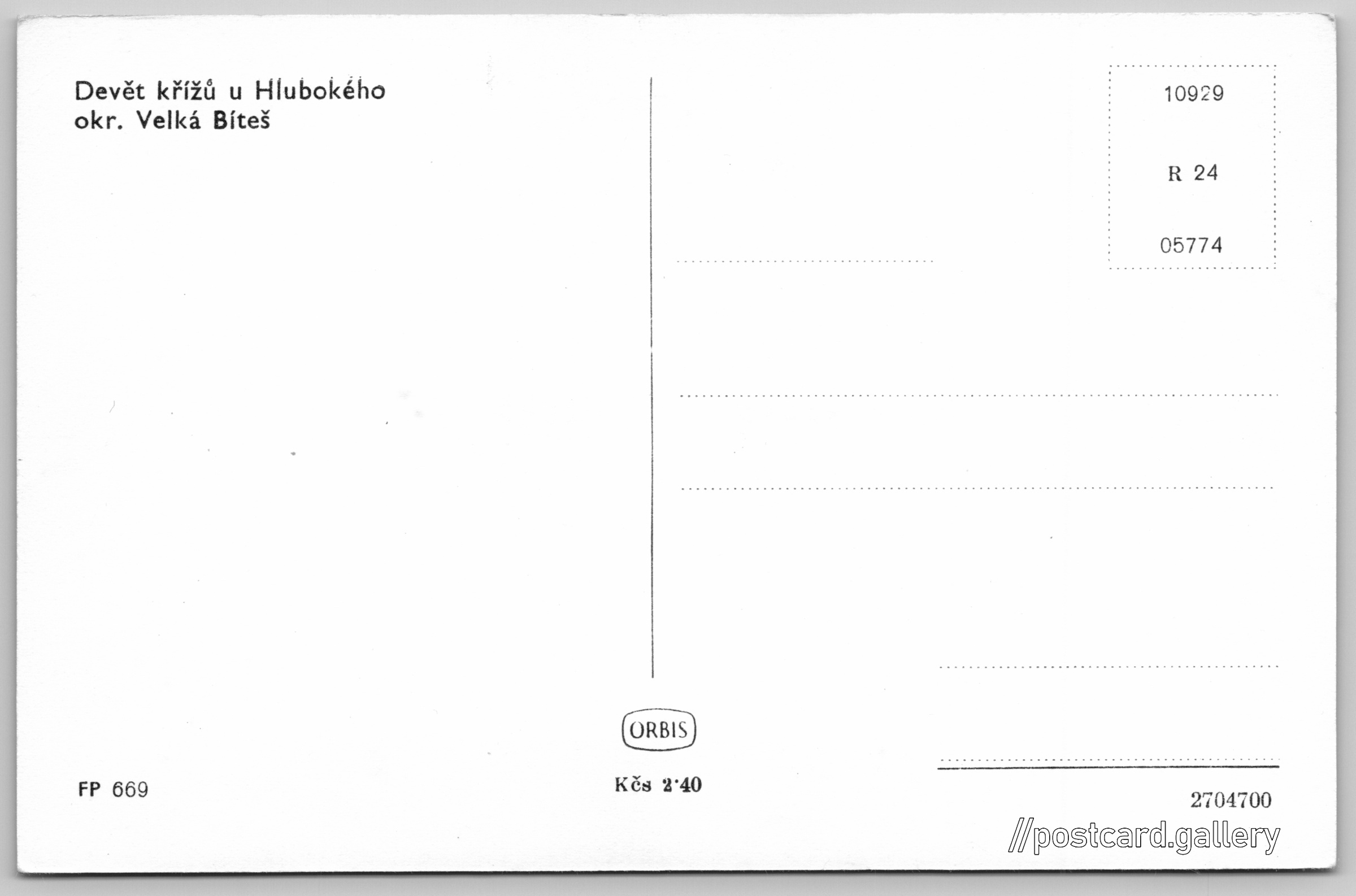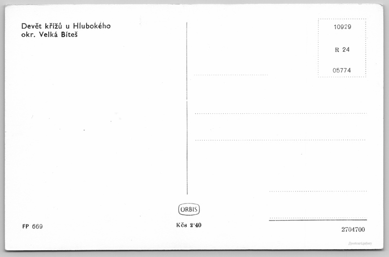 Devět křížů u Hlubokého Pokud chcete vidět pohlednice ve vyšším rozlišení nebo zobrazovat jejich zadní stranu, tak se prosím nejdříve přihlašte Přihlásit Zaregistrovat Devět křížů u Hlubokéhookr. Velká Bíteš Jazyk tištěného textu na pohlednici: čeština Lesní Hluboké, Brno-venkov ukázat na mapě Vydavatel: Nakladatelství Orbis (Československo) Datum vydání není známo Pomozte nám odhadnout datum vzniku pohlednice Velikost (š x v) a tvar pohlednice: 138 x 90 mm (5.43" x 3.54"), obdélník Čistá pohlednice (neprošlá poštou) Ceny: Cena pohlednice: 2,40 Kčs (CSK) Kódy na pohlednici: FP 669 10929 R 24 05774 2704700 DiskuseVložit příspěvek Přidat novou složku ... Spravovat složky ...