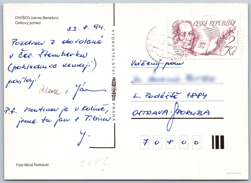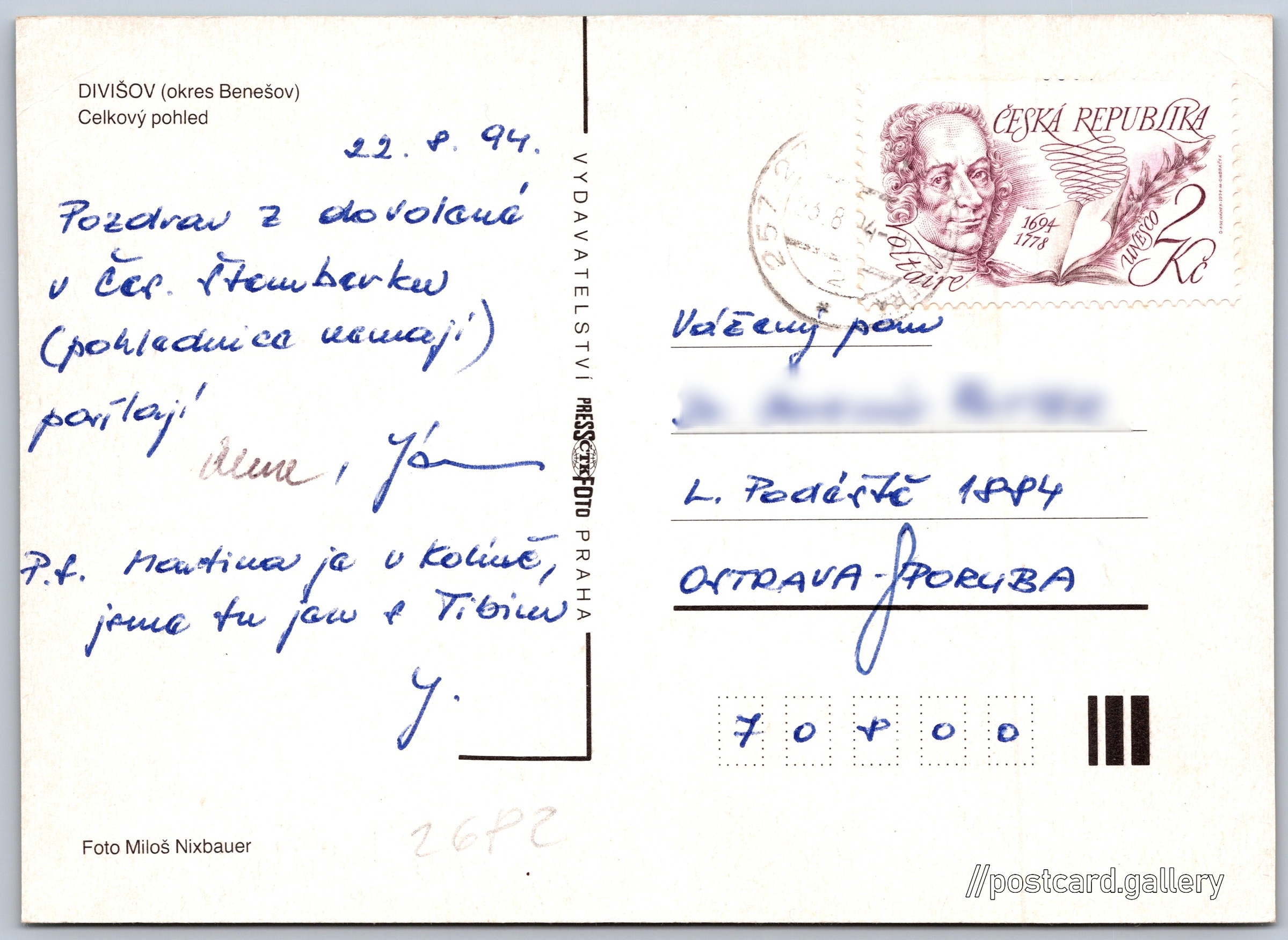 Divišov Pokud chcete vidět pohlednice ve vyšším rozlišení nebo zobrazovat jejich zadní stranu, tak se prosím nejdříve přihlašte Přihlásit Zaregistrovat Divišov DIVIŠOV (okres Benešov)Celkový pohled Jazyk tištěného textu na pohlednici: čeština Divišov, Městys, Česko ukázat na mapě Vydavatel: PressFoto Praha (Československo) Odhadované datum vydání pohlednice: 1991 - 1994 Pomozte nám zpřesnit rok vzniku pohlednice Velikost (š x v) a tvar pohlednice: 146 x 105 mm (5.75" x 4.13"), obdélník Osoby spjaté s touto pohlednicí: Miloš Nixbauer(Autor fotografie) Prošlá poštou:Datum na razítku: 23.8.1994Datum napsání pohledu: 22.8.1994 Ceny: Vyplacené známky: 2,00 Kč (CZK) DiskuseVložit příspěvek Přidat novou složku ... Spravovat složky ...