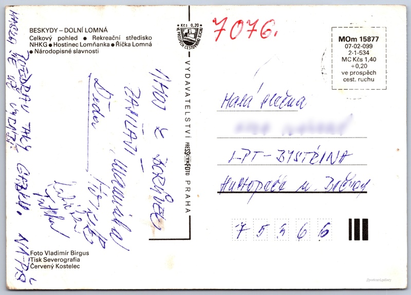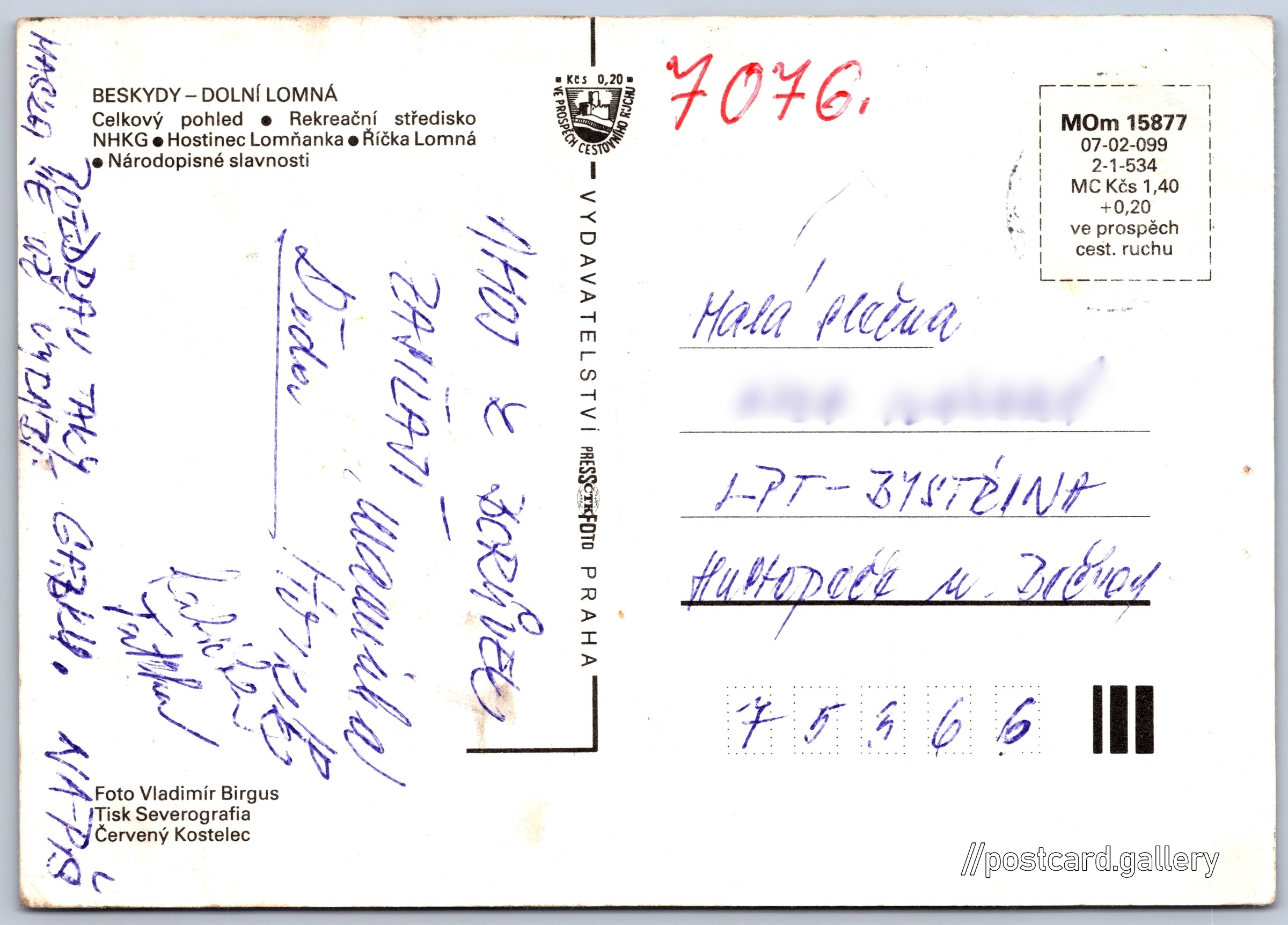 Dolní Lomná Pokud chcete vidět pohlednice ve vyšším rozlišení nebo zobrazovat jejich zadní stranu, tak se prosím nejdříve přihlašte Přihlásit Zaregistrovat Dolní Lomná BESKYDY - DOLNÍ LOMNÁ- Celkový pohled- Rekreační středisko NHKG- Hostinec Lomňanka- Říčka Lomná- Národopisné slavnosti Jazyk tištěného textu na pohlednici: čeština Dolní Lomná ev. č. 288, Dolní Lomná, 739 91, Frýdek-Místek ukázat na mapě Vydavatel: PressFoto Praha (Československo) Rok vydání pohlednice: 1990 Velikost (š x v) a tvar pohlednice: 147 x 105 mm (5.79" x 4.13"), obdélník Osoby spjaté s touto pohlednicí: Vladimír Birgus(Autor fotografie) Prošlá poštou Ceny: Cena pohlednice: 1,40 Kčs (CSK) (+0,20 Kčs přípl. na tur. ruch) Kódy na pohlednici: MOm 15877 07-02-099 2-1-534 DiskuseVložit příspěvek Přidat novou složku ... Spravovat složky ...