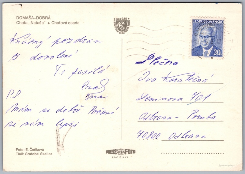 Domaša, Dobrá Pokud chcete vidět pohlednice ve vyšším rozlišení nebo zobrazovat jejich zadní stranu, tak se prosím nejdříve přihlašte Přihlásit Zaregistrovat Domaša Dobrá DOMAŠA-DOBRÁ- Chata "Nataša"- Chatová osada Jazyk tištěného textu na pohlednici: slovenština Chata - Domaša Dobrá, Vranovská cesta, Kvakovce, Slovensko ukázat na mapě V blízkém okolí místa zobrazeného na pohlednici lze najít 4 jiné pohlednice. Zobrazit blízké pohlednice Vydavatel: PressFoto Bratislava (Československo) Datum vydání není známo Pomozte nám odhadnout datum vzniku pohlednice Velikost (š x v) a tvar pohlednice: 149 x 105 mm (5.87" x 4.13"), obdélník Osoby spjaté s touto pohlednicí: Emilia Čeňková(Autor fotografie) Prošlá poštou Ceny: Příplatek na tur. ruch: 0,20 Kčs (CSK))Vyplacené známky: 0,30 Kčs (CSK) DiskuseVložit příspěvek Přidat novou složku ... Spravovat složky ...