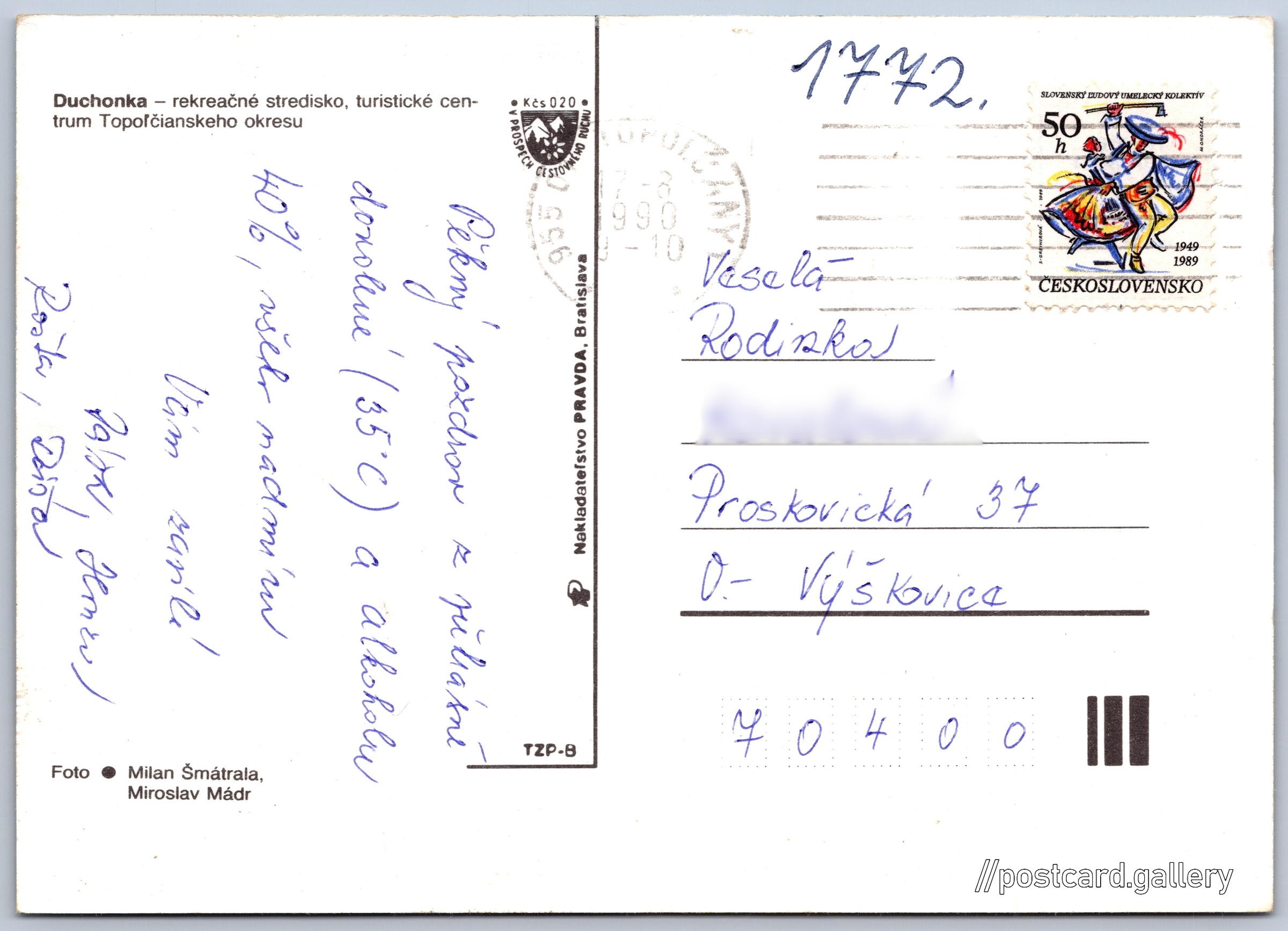 Duchonka Pokud chcete vidět pohlednice ve vyšším rozlišení nebo zobrazovat jejich zadní stranu, tak se prosím nejdříve přihlašte Přihlásit Zaregistrovat Duchonka Duchonka - rekreačné stredisko, turistické centrum Topoľčianskeho okresu Jazyk tištěného textu na pohlednici: slovenština Prašice 1340 ukázat na mapě Vydavatel: Nakladateľstvo PRAVDA, Bratislava (Československo) Odhadované datum vydání pohlednice: 1987 - 1990 Pomozte nám zpřesnit rok vzniku pohlednice Velikost (š x v) a tvar pohlednice: 147 x 104 mm (5.79" x 4.09"), obdélník Osoby spjaté s touto pohlednicí: Milan Šmátrala(Autor fotografie) Miroslav Mádr(Autor fotografie) Prošlá poštou:Datum na razítku: 17.8.1990 Ceny: Příplatek na tur. ruch: 0,20 Kčs (CSK))Vyplacené známky: 0,50 Kčs (CSK) DiskuseVložit příspěvek Přidat novou složku ... Spravovat složky ...