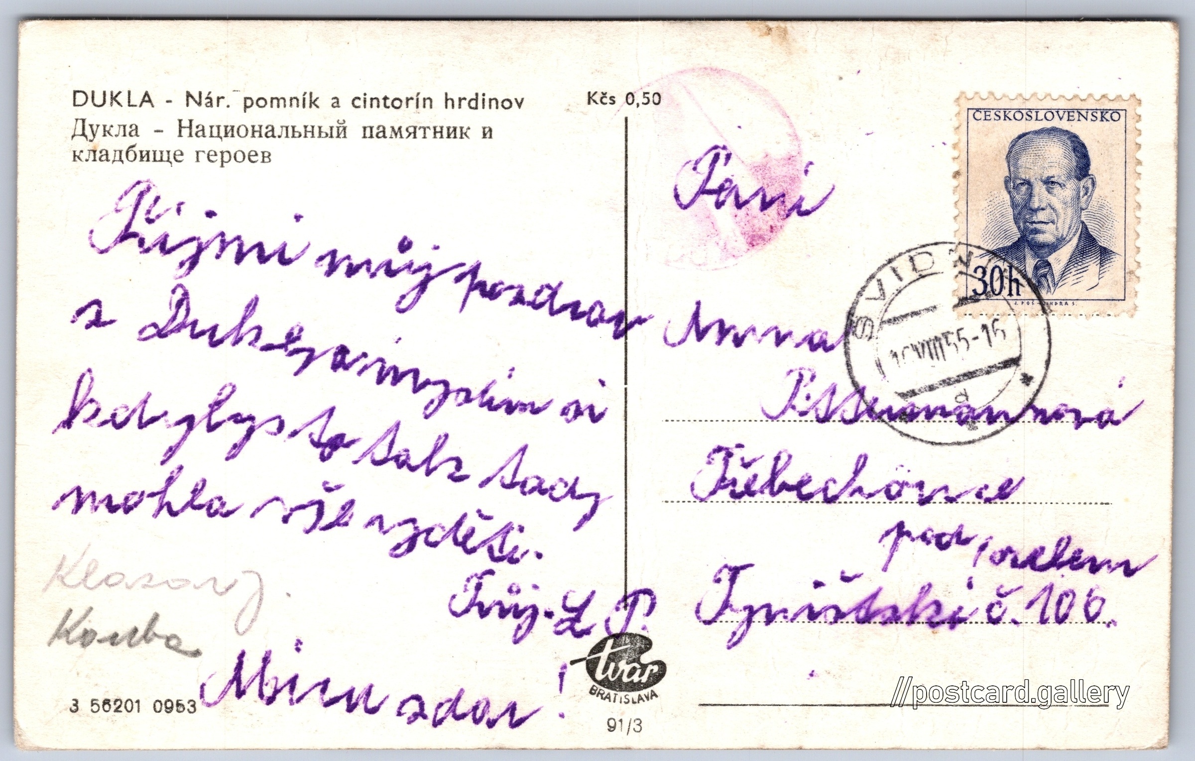 Dukla, Národní památník a hřbitov hrdinů Pokud chcete vidět pohlednice ve vyšším rozlišení nebo zobrazovat jejich zadní stranu, tak se prosím nejdříve přihlašte Přihlásit Zaregistrovat DUKLA - Nár. pomník a cintorín hrdinovДукла - Национальный памятник и кладбище героев Jazyky tištěného textu na pohlednici: slovenština, ruština Vydavatel: Tvar Bratislava (Československo) Odhadované datum vydání pohlednice: 1953 - 1955 Pomozte nám zpřesnit rok vzniku pohlednice Velikost (š x v) a tvar pohlednice: 138 x 87 mm (5.43" x 3.43"), obdélník Prošlá poštou:Datum na razítku: 10.8.1955 Ceny: Cena pohlednice: 0,50 Kčs (CSK)Vyplacené známky: 0,30 Kčs (CSK) Kódy na pohlednici: 3 56201 0953 91/3 DiskuseVložit příspěvek Přidat novou složku ... Spravovat složky ...