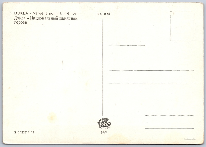 Dukla, národní pomník hrdinům Pokud chcete vidět pohlednice ve vyšším rozlišení nebo zobrazovat jejich zadní stranu, tak se prosím nejdříve přihlašte Přihlásit Zaregistrovat DUKLA - Národný pomník hrdinovДукла - Национальный памятник героев Jazyky tištěného textu na pohlednici: slovenština, ruština Vyšný Komárnik ukázat na mapě V blízkém okolí místa zobrazeného na pohlednici lze najít 10 jiných pohlednic. Zobrazit blízké pohlednice Vydavatel: Tvar Bratislava (Československo) Rok vydání pohlednice: listopad, 1953 Velikost (š x v) a tvar pohlednice: 147 x 104 mm (5.79" x 4.09"), obdélník Čistá pohlednice (neprošlá poštou) Ceny: Cena pohlednice: 0,60 Kčs (CSK) Kódy na pohlednici: 3 56227 1153 91/5 DiskuseVložit příspěvek Přidat novou složku ... Spravovat složky ...