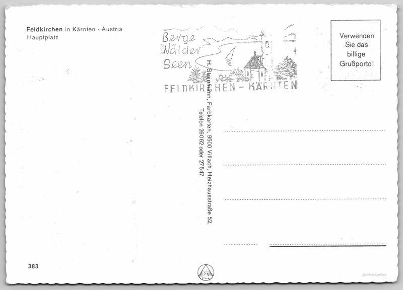Feldkirchen, náměstí Pokud chcete vidět pohlednice ve vyšším rozlišení nebo zobrazovat jejich zadní stranu, tak se prosím nejdříve přihlašte Přihlásit Zaregistrovat Feldkirchen Feldkirchen in Kärnten - AustriaHauptplatz Jazyk tištěného textu na pohlednici: němčina Hauptplatz 16 ukázat na mapě Vydavatel: H. Steinmann, Farbkarten (Rakousko) Datum vydání není známo Pomozte nám odhadnout datum vzniku pohlednice Velikost (š x v) a tvar pohlednice: 147 x 104 mm (5.79" x 4.09"), obdélník, zoubkovaný Čistá pohlednice (neprošlá poštou) Kódy na pohlednici: 383 DiskuseVložit příspěvek Přidat novou složku ... Spravovat složky ...