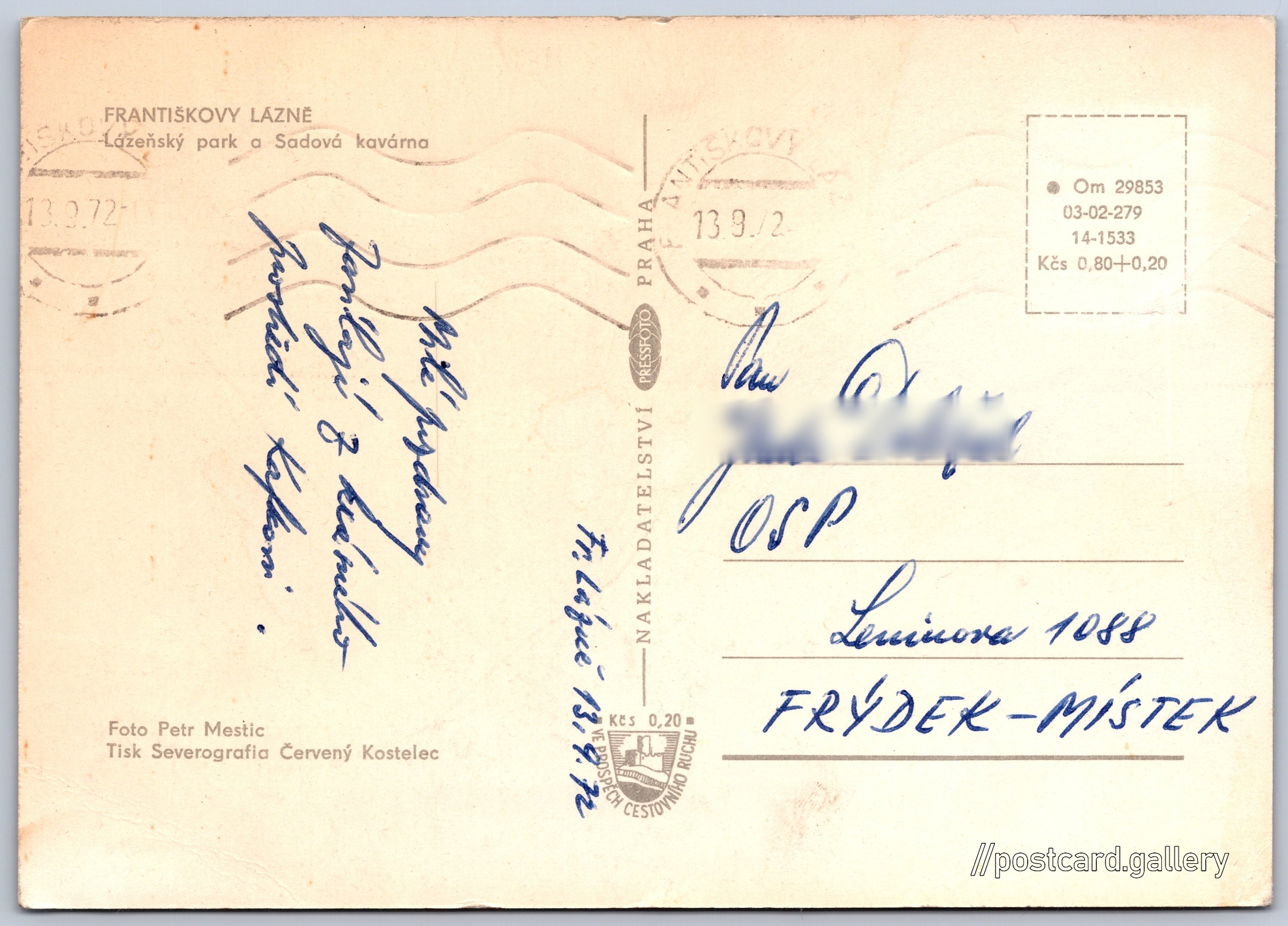 Františkovy Lázně, park a Sadová kavárna 3/49 Pokud chcete vidět pohlednice ve vyšším rozlišení nebo zobrazovat jejich zadní stranu, tak se prosím nejdříve přihlašte Přihlásit Zaregistrovat FRANTIŠKOVY LÁZNĚLázeňský park a Sadová kavárna Jazyk tištěného textu na pohlednici: čeština Restaurace - Kavárna Sadová, Ruská 60/1, Františkovy Lázně, Česko ukázat na mapě V blízkém okolí místa zobrazeného na pohlednici lze najít 50 jiných pohlednic. Zobrazit blízké pohlednice Vydavatel: PressFoto Praha (Československo) Rok vydání pohlednice: 1972 Velikost (š x v) a tvar pohlednice: 148 x 105 mm (5.83" x 4.13"), obdélník Osoby spjaté s touto pohlednicí: Petr Mestic(Autor fotografie) Prošlá poštou:Datum na razítku: 13.9.1972Datum napsání pohledu: 13.9.1972 Ceny: Cena pohlednice: 0,80 Kčs (CSK) (+0,20 Kčs přípl. na tur. ruch) Kódy na pohlednici: •Om 29853 03-02-279 14-1533 DiskuseVložit příspěvek Přidat novou složku ... Spravovat složky ...
