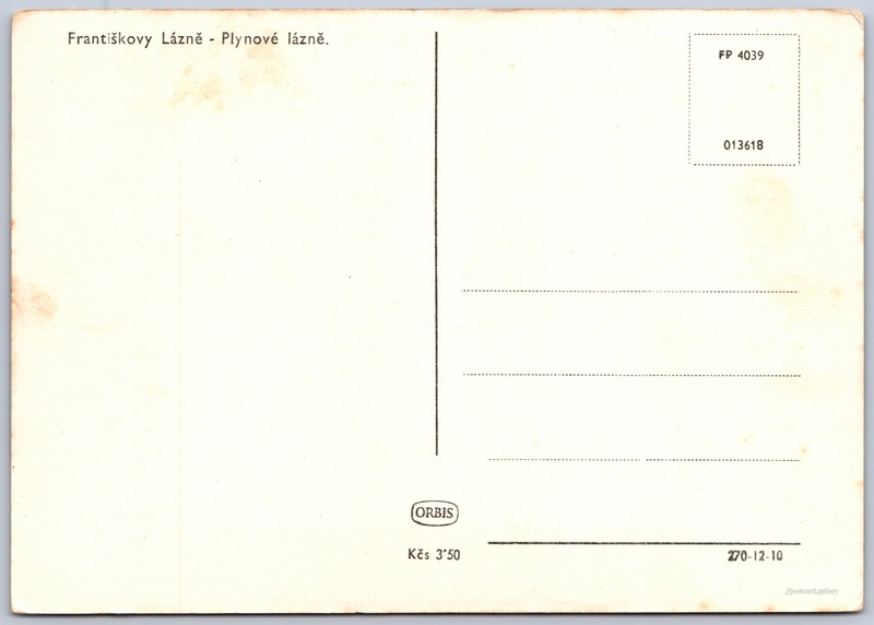 Františkovy lázně, Plynové lázně 9/50 Pokud chcete vidět pohlednice ve vyšším rozlišení nebo zobrazovat jejich zadní stranu, tak se prosím nejdříve přihlašte Přihlásit Zaregistrovat Františkovy Lázně - Plynové lázně. Jazyk tištěného textu na pohlednici: čeština Boženy Němcové 116/21, Františkovy Lázně, 351 01, Cheb ukázat na mapě V blízkém okolí místa zobrazeného na pohlednici lze najít 50 jiných pohlednic. Zobrazit blízké pohlednice Vydavatel: Nakladatelství Orbis (Československo) Odhadované datum vydání pohlednice: 1950 - 1953 Pomozte nám zpřesnit rok vzniku pohlednice Velikost (š x v) a tvar pohlednice: 147 x 104 mm (5.79" x 4.09"), obdélník Čistá pohlednice (neprošlá poštou) Ceny: Cena pohlednice: 3,50 Kčs (CSK) Kódy na pohlednici: FP 4039 013618 270-12-10 DiskuseVložit příspěvek Přidat novou složku ... Spravovat složky ...