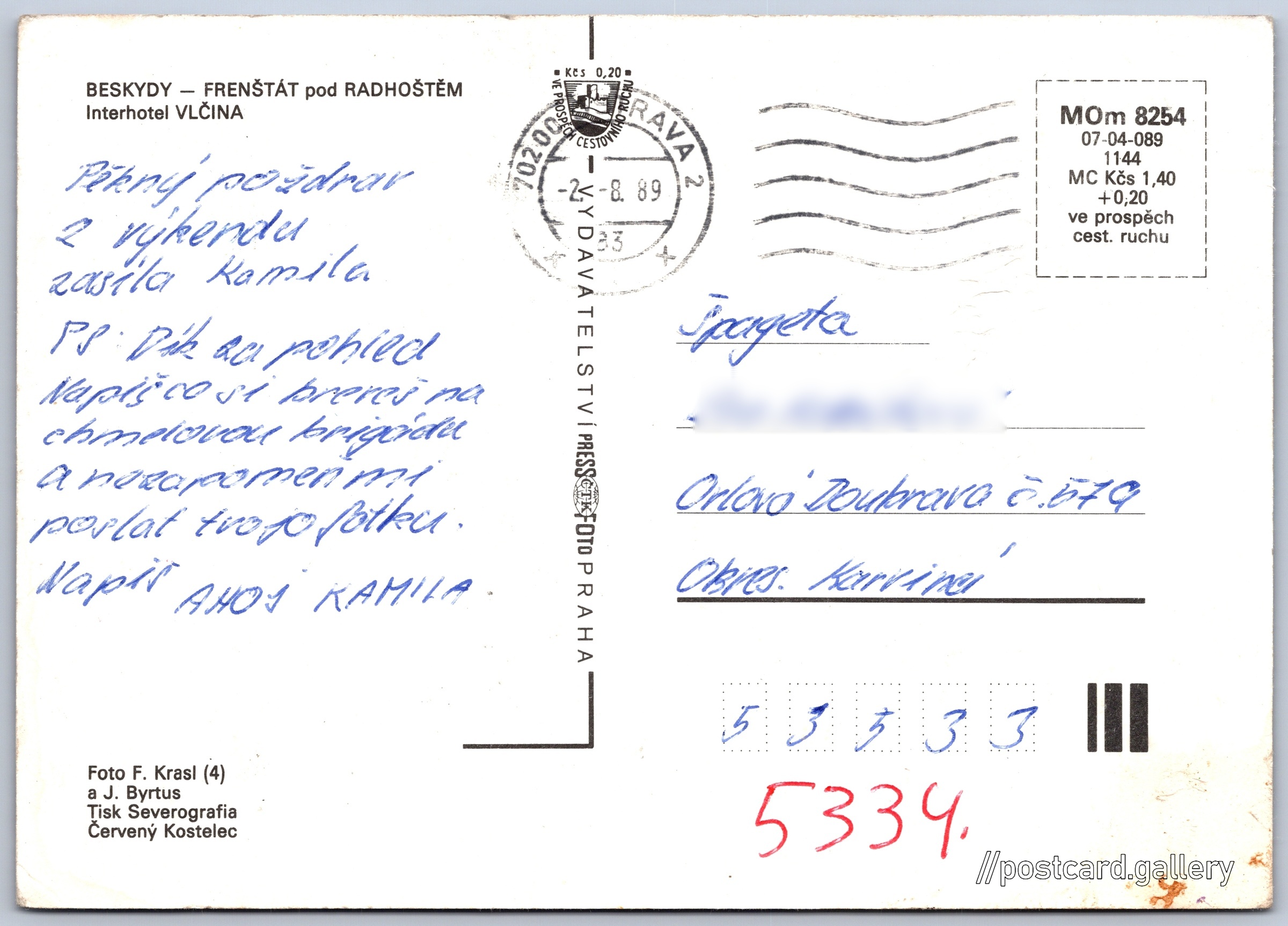 Frenštát pod Radhoštem, interhotel Vlčina Pokud chcete vidět pohlednice ve vyšším rozlišení nebo zobrazovat jejich zadní stranu, tak se prosím nejdříve přihlašte Přihlásit Zaregistrovat Interhotel VlčinaFrenštát pod Radhoštem BESKYDY - FRENŠTÁT pod RADHOŠTĚMInterhotel VLČINA Jazyk tištěného textu na pohlednici: čeština Horečky 616, Frenštát pod Radhoštěm, 744 01, Nový Jičín ukázat na mapě V blízkém okolí místa zobrazeného na pohlednici lze najít 3 jiné pohlednice. Zobrazit blízké pohlednice Vydavatel: PressFoto Praha (Československo) Rok vydání pohlednice: 1980 Velikost (š x v) a tvar pohlednice: 148 x 105 mm (5.83" x 4.13"), obdélník Osoby spjaté s touto pohlednicí: Jan Byrtus(Autor fotografie) František Krasl(Autor fotografie) Prošlá poštou:Datum na razítku: 2.8.1989 Ceny: Cena pohlednice: 1,40 Kčs (CSK) (+0,20 Kčs přípl. na tur. ruch) Kódy na pohlednici: MOm 8254 07-04-089 1144 DiskuseVložit příspěvek Přidat novou složku ... Spravovat složky ...