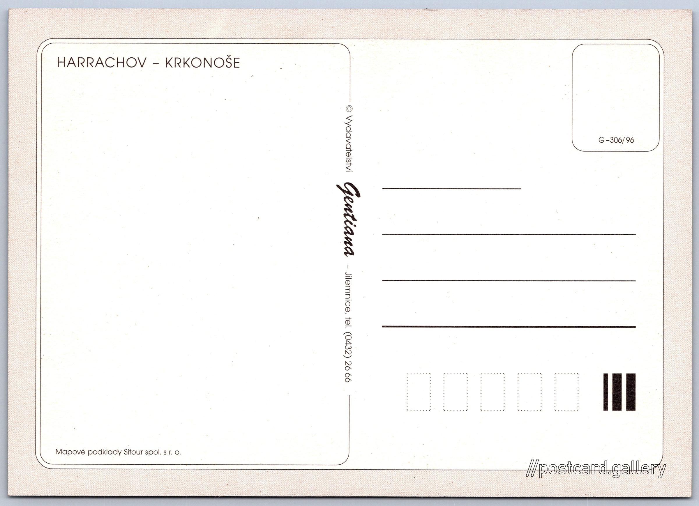Harrachov, mapa Pokud chcete vidět pohlednice ve vyšším rozlišení nebo zobrazovat jejich zadní stranu, tak se prosím nejdříve přihlašte Přihlásit Zaregistrovat Harrachov HARRACHOV – KRKONOŠEMapové podklady Sitour spol. s r. o. Jazyk tištěného textu na pohlednici: čeština Harrachov, Město, Česko ukázat na mapě Vydavatel: Vydavatelství Gentiana (Česko) Rok vydání pohlednice: 1996 Velikost (š x v) a tvar pohlednice: 148 x 105 mm (5.83" x 4.13"), obdélník Čistá pohlednice (neprošlá poštou) Kódy na pohlednici: G-306/96 DiskuseVložit příspěvek Přidat novou složku ... Spravovat složky ...