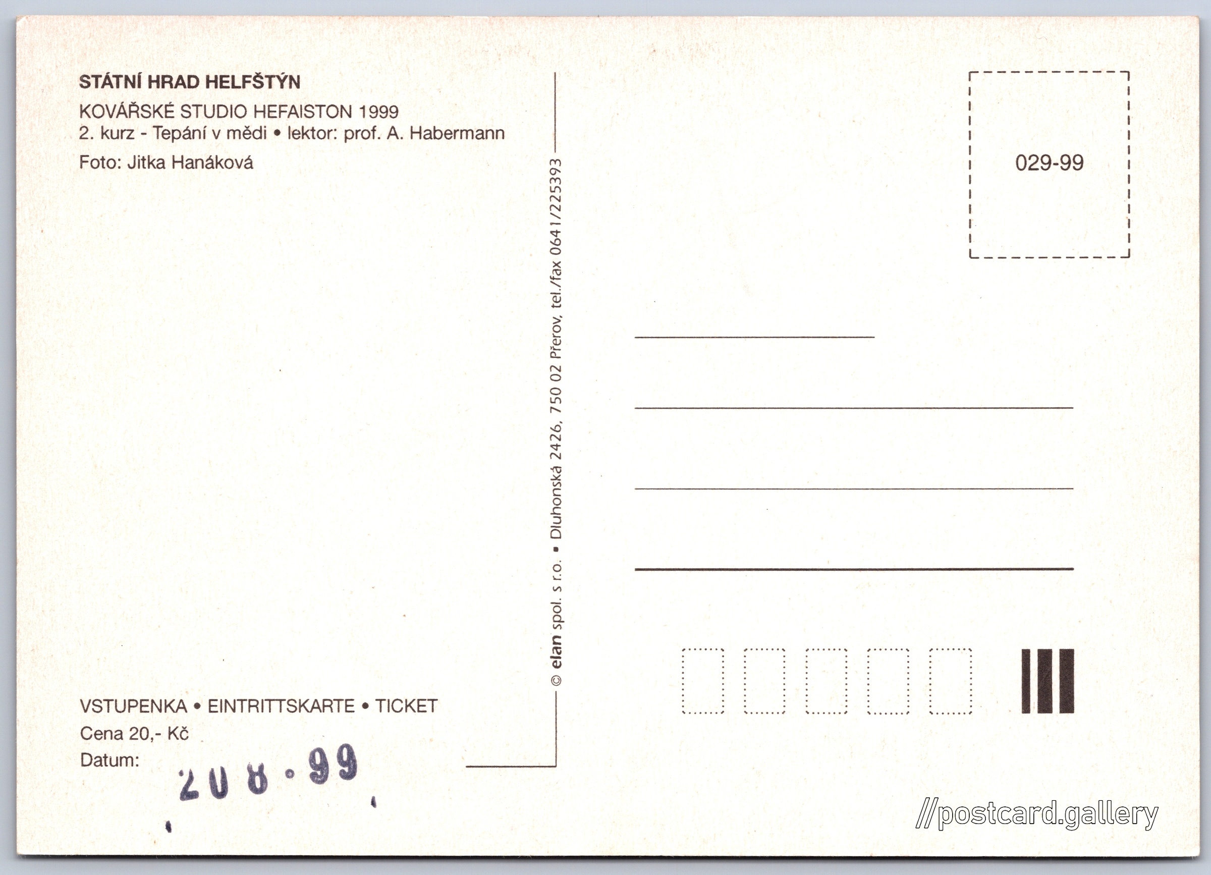 Helfštýn, kovářské studio, vstupenka Pokud chcete vidět pohlednice ve vyšším rozlišení nebo zobrazovat jejich zadní stranu, tak se prosím nejdříve přihlašte Přihlásit Zaregistrovat H Studio STÁTNÍ HRAD HELFŠTÝNKOVÁŘSKÉ STUDIO HEFAISTON 19992. kurz - Tepání v mědi lektor - prof. A. HabermannVSTUPENKA EINTRITTSKARTE TICKETCena 20,- Kč Jazyk tištěného textu na pohlednici: čeština Týn nad Bečvou 60, 751 31 Týn nad Bečvou, Czechia ukázat na mapě V blízkém okolí místa zobrazeného na pohlednici lze najít 3 jiné pohlednice. Zobrazit blízké pohlednice Vydavatel: Elan Přerov (Česko) Rok vydání pohlednice: 1999 Velikost (š x v) a tvar pohlednice: 148 x 104 mm (5.83" x 4.09"), obdélník Osoby spjaté s touto pohlednicí: prof. A. Habermann(Obsah pohlednice) Jitka Hanáková(Autor fotografie) Čistá pohlednice (neprošlá poštou) Kódy na pohlednici: 029-99 DiskuseVložit příspěvek Přidat novou složku ... Spravovat složky ...