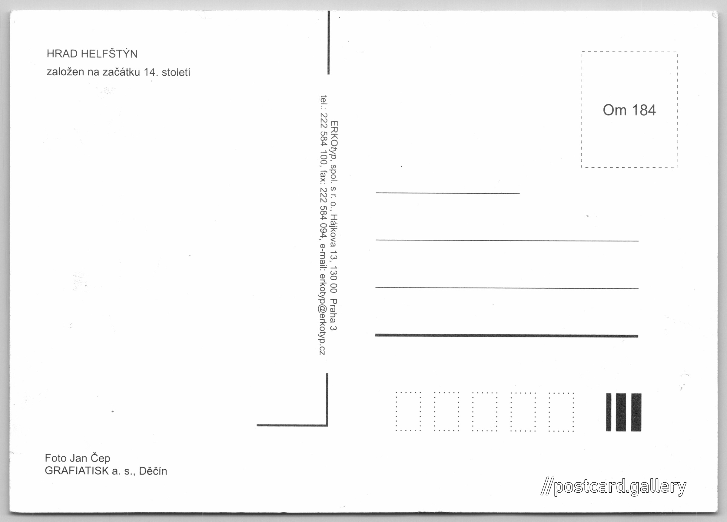 Helfštýn, letecký pohled s mapkou Pokud chcete vidět pohlednice ve vyšším rozlišení nebo zobrazovat jejich zadní stranu, tak se prosím nejdříve přihlašte Přihlásit Zaregistrovat Helfštýn HRAD HELFŠTÝNzaložen na začátku 14. století Jazyk tištěného textu na pohlednici: čeština Týn nad Bečvou 60, 751 31 Týn nad Bečvou, Czechia ukázat na mapě V blízkém okolí místa zobrazeného na pohlednici lze najít 3 jiné pohlednice. Zobrazit blízké pohlednice Vydavatel: ERKOtyp (Česko) Datum vydání není známo Pomozte nám odhadnout datum vzniku pohlednice Velikost (š x v) a tvar pohlednice: 148 x 105 mm (5.83" x 4.13"), obdélník Osoby spjaté s touto pohlednicí: Jan Čep(Autor fotografie) Čistá pohlednice (neprošlá poštou) Kódy na pohlednici: Om 184 DiskuseVložit příspěvek Přidat novou složku ... Spravovat složky ...