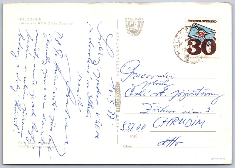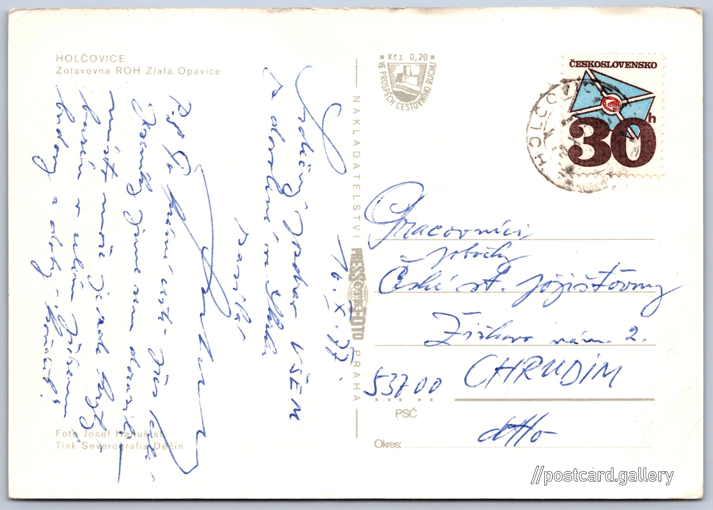 Holčovice, zotavovna Zlatá Opavice Pokud chcete vidět pohlednice ve vyšším rozlišení nebo zobrazovat jejich zadní stranu, tak se prosím nejdříve přihlašte Přihlásit Zaregistrovat HOLČOVICEZotavovna ROH Zlatá Opavice Jazyk tištěného textu na pohlednici: čeština Hotel Zlatá Opavice, Komora 37, Holčovice - Komora, Česko ukázat na mapě V blízkém okolí místa zobrazeného na pohlednici lze najít 1 jinou pohlednici. Zobrazit blízké pohlednice Vydavatel: PressFoto Praha (Československo) Odhadované datum vydání pohlednice: 1974 - 1977 Pomozte nám zpřesnit rok vzniku pohlednice Velikost (š x v) a tvar pohlednice: 148 x 105 mm (5.83" x 4.13"), obdélník Osoby spjaté s touto pohlednicí: Josef Hanuš(Autor fotografie) Prošlá poštou:Datum na razítku: 10.10.1977Datum napsání pohledu: 10.10.1977 Ceny: Příplatek na tur. ruch: 0,20 Kčs (CSK))Vyplacené známky: 0,30 Kčs (CSK) DiskuseVložit příspěvek Přidat novou složku ... Spravovat složky ...
