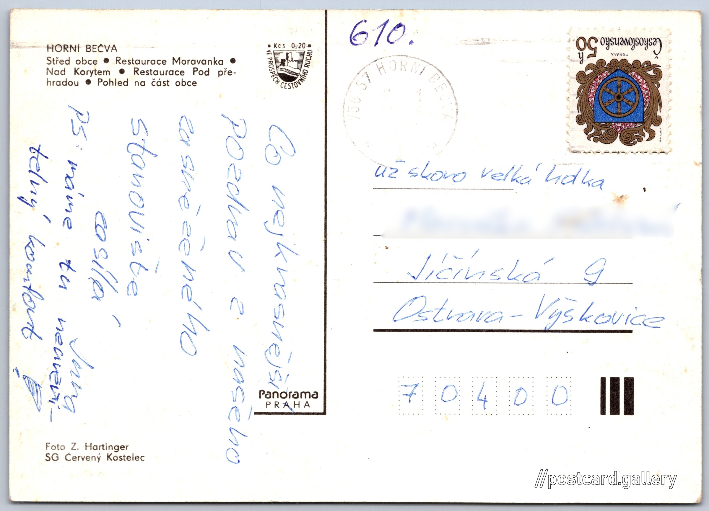 Horní Bečva Pokud chcete vidět pohlednice ve vyšším rozlišení nebo zobrazovat jejich zadní stranu, tak se prosím nejdříve přihlašte Přihlásit Zaregistrovat Horní Bečva HORNÍ BEČVA- Střed obce- Restaurace Moravanka- Nad Korytem- Restaurace Pod přehradou- Pohled na část obce Jazyk tištěného textu na pohlednici: čeština Horní Bečva 367, Horní Bečva, 756 57, Vsetín ukázat na mapě Vydavatel: Panorama (Československo) Datum vydání není známo Pomozte nám odhadnout datum vzniku pohlednice Velikost (š x v) a tvar pohlednice: 147 x 105 mm (5.79" x 4.13"), obdélník Osoby spjaté s touto pohlednicí: Zd. Hartinger(Autor fotografie) Prošlá poštou Ceny: Příplatek na tur. ruch: 0,20 Kčs (CSK))Vyplacené známky: 0,50 Kčs (CSK) DiskuseVložit příspěvek Přidat novou složku ... Spravovat složky ...