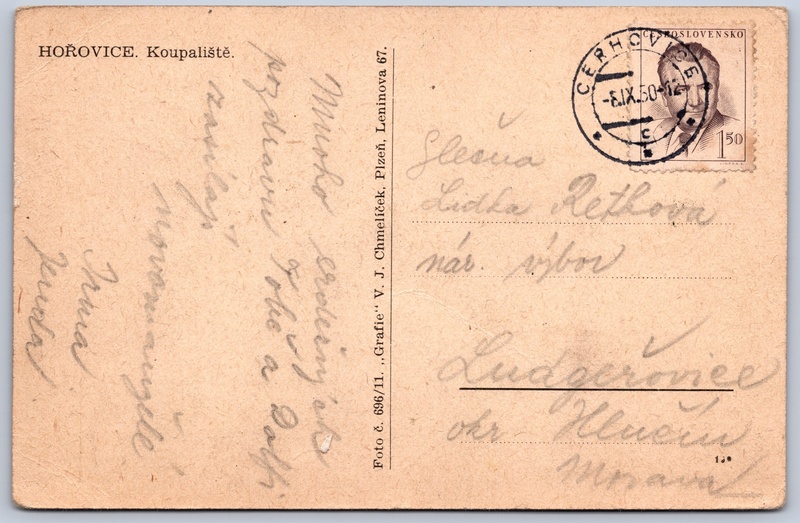 Hořovice, koupaliště Pokud chcete vidět pohlednice ve vyšším rozlišení nebo zobrazovat jejich zadní stranu, tak se prosím nejdříve přihlašte Přihlásit Zaregistrovat HOŘOVICE. Koupaliště. Jazyk tištěného textu na pohlednici: čeština Hořovice, Beroun ukázat na mapě V blízkém okolí místa zobrazeného na pohlednici lze najít 2 jiné pohlednice. Zobrazit blízké pohlednice Vydavatel: Grafie, V. J. Chmelíček (Československo) Odhadované datum vydání pohlednice: 1947 - 1950 Pomozte nám zpřesnit rok vzniku pohlednice Velikost (š x v) a tvar pohlednice: 139 x 91 mm (5.47" x 3.58"), obdélník Prošlá poštou:Datum na razítku: 8.9.1950 Ceny: Vyplacené známky: 1,50 Kčs (CSK) Kódy na pohlednici: 696/11 DiskuseVložit příspěvek Přidat novou složku ... Spravovat složky ...