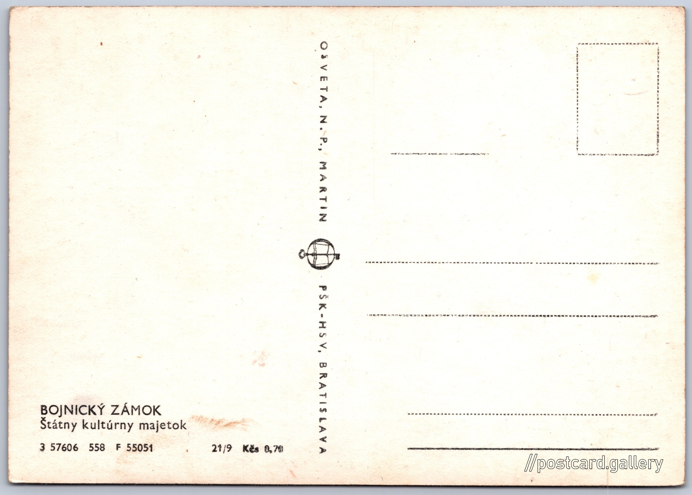 Hrad Bojnice Pokud chcete vidět pohlednice ve vyšším rozlišení nebo zobrazovat jejich zadní stranu, tak se prosím nejdříve přihlašte Přihlásit Zaregistrovat BOJNICKÝ ZÁMOKŠtátny kultúrny majetok Jazyk tištěného textu na pohlednici: slovenština Vydavatel: Osveta, n. p., Martin PŠK - Bratislava (Československo) Rok vydání pohlednice: květen, 1958 Velikost (š x v) a tvar pohlednice: 146 x 102 mm (5.75" x 4.02"), obdélník Čistá pohlednice (neprošlá poštou) Ceny: Cena pohlednice: 0,70 Kčs (CSK) Kódy na pohlednici: 3 57606 558 F 55051 21/9 DiskuseVložit příspěvek Přidat novou složku ... Spravovat složky ...