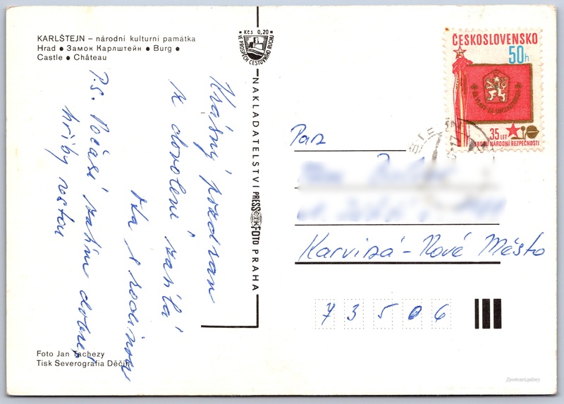 Hrad Karlštejn Pokud chcete vidět pohlednice ve vyšším rozlišení nebo zobrazovat jejich zadní stranu, tak se prosím nejdříve přihlašte Přihlásit Zaregistrovat KARLŠTEJN – národní kulturní památka- Hrad- Замок Карлштейн- Burg- Castle- Château Jazyky tištěného textu na pohlednici: čeština, ruština, němčina, angličtina, francouzština, francouzština Hrad Karlštejn, Hrad, Karlštejn 172, Karlštejn, Česko ukázat na mapě V blízkém okolí místa zobrazeného na pohlednici lze najít 20 jiných pohlednic. Zobrazit blízké pohlednice Vydavatel: PressFoto Praha (Československo) Odhadované datum vydání pohlednice: 1978 - 1980 Pomozte nám zpřesnit rok vzniku pohlednice Velikost (š x v) a tvar pohlednice: 148 x 105 mm (5.83" x 4.13"), obdélník Osoby spjaté s touto pohlednicí: Jan Tachezy(Autor fotografie) Prošlá poštou Ceny: Příplatek na tur. ruch: 0,20 Kčs (CSK))Vyplacené známky: 0,50 Kčs (CSK) DiskuseVložit příspěvek Přidat novou složku ... Spravovat složky ...