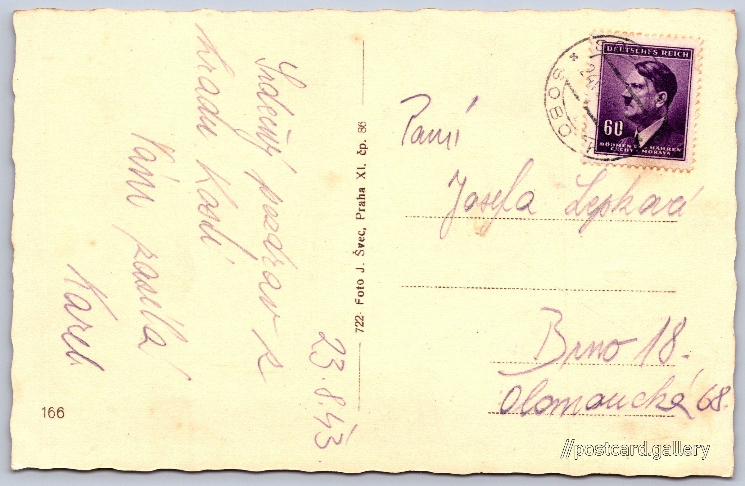 Hrad Kost Pokud chcete vidět pohlednice ve vyšším rozlišení nebo zobrazovat jejich zadní stranu, tak se prosím nejdříve přihlašte Přihlásit Zaregistrovat Hrad Kost Jazyk tištěného textu na pohlednici: čeština Hrad Kost, Hrad, Libošovice - Podkost, Česko ukázat na mapě V blízkém okolí místa zobrazeného na pohlednici lze najít 5 jiných pohlednic. Zobrazit blízké pohlednice Vydavatel: Foto J. Švec (Československo) Odhadované datum vydání pohlednice: 1940 - 1943 Pomozte nám zpřesnit rok vzniku pohlednice Velikost (š x v) a tvar pohlednice: 138 x 90 mm (5.43" x 3.54"), obdélník, zoubkovaný Prošlá poštou:Datum na razítku: 24.8.1943Datum napsání pohledu: 23.8.1943 Ceny: Vyplacené známky: 0,60 Kčs (CSK) Kódy na pohlednici: 166 722 DiskuseVložit příspěvek Přidat novou složku ... Spravovat složky ...